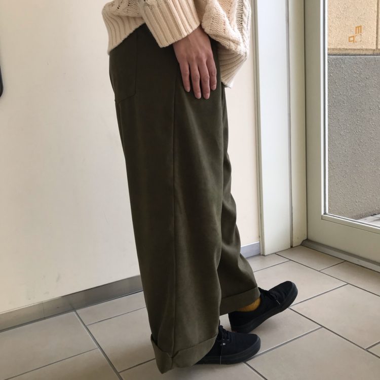 model:H161cm 【起毛布帛ワイドパンツ】 No.162-852-0191440 Size.F Col.カーキ(着用).ブラック チャコール.ベージュ OUTLET PRICE¥3,900+税 薄手ながら程良くハリのある生地で 仕立てられたパンツです。 ワタリをゆったり取った ワイドシルエットが特徴的! ピーチスキンの落ち着きのある生地で 大人のカジュアルコーデが楽しめます♪ ウエストはゴム仕様になっているので リラックス感のある着心地も魅力的♡