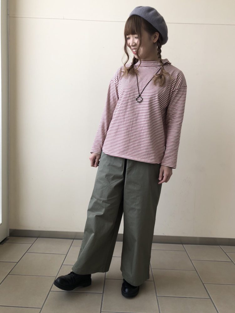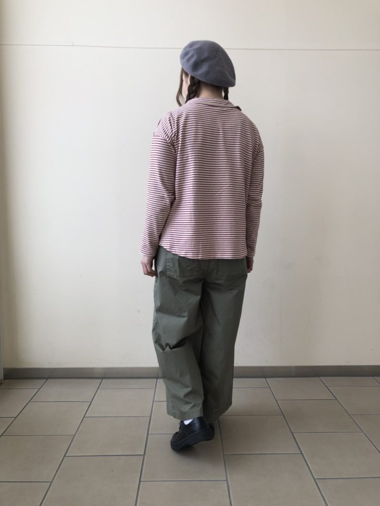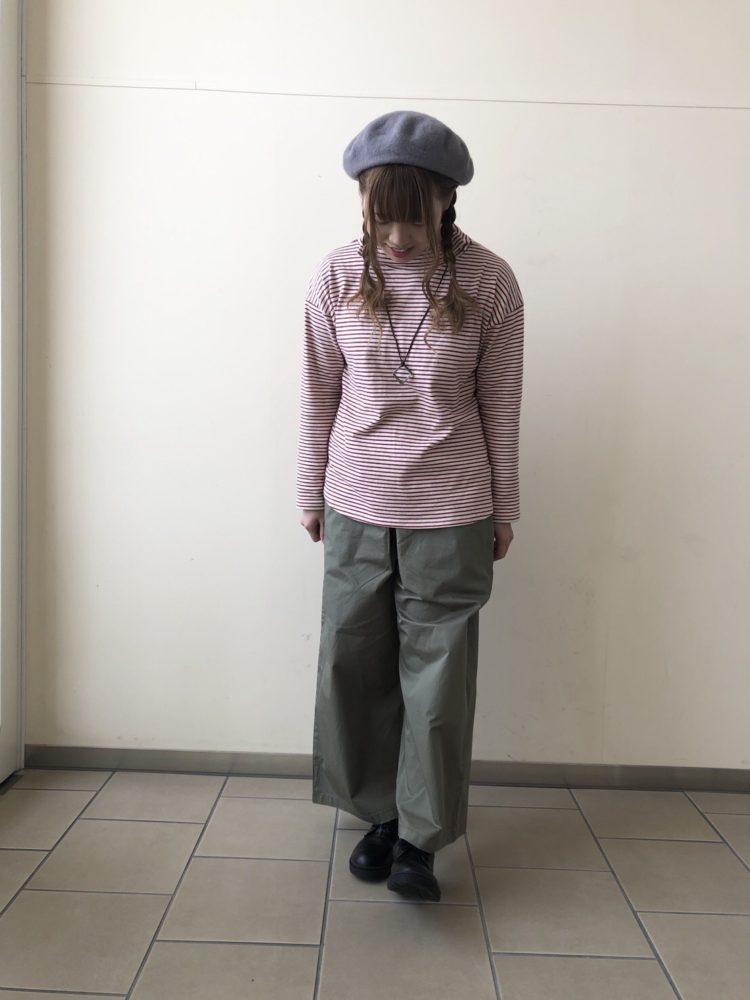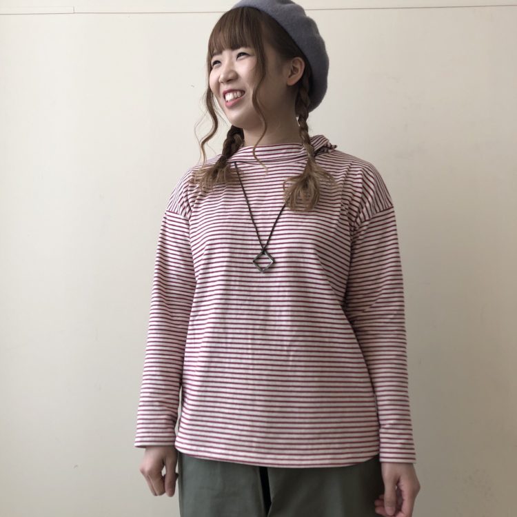 model:H160cm 【衿スリット入りハイネックBDPO】 No.160-905-0PF9090 Size.L Col.グリーン、アカ(着用)、イエロー、ネイビー PRICE¥2,900+税 肩が落ちたデザインになっており 程よくゆったりしていて、 生地は綿100%で着心地良く お手入れも楽チン! ボーダー柄は何枚あっても 着回しやすいアイテムですね! ノースオブジェクトプチらしい 細かいデザインにも惹かれます…♡