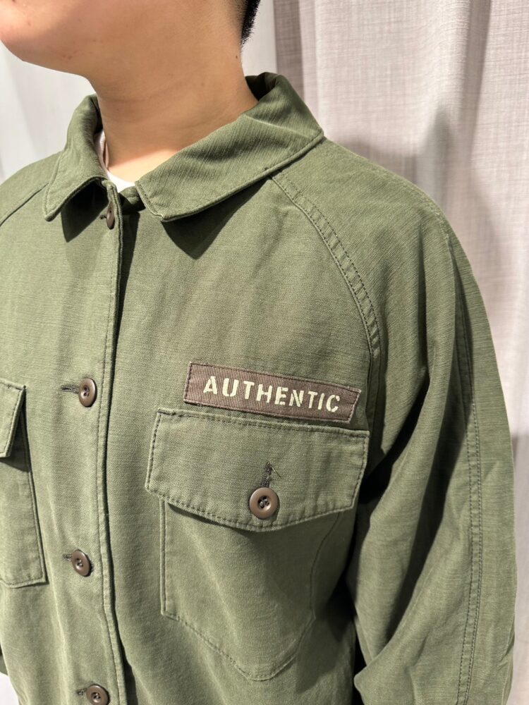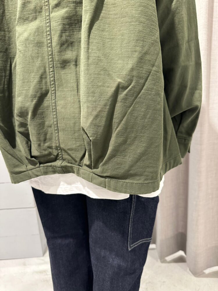テーパードしたボトムとバルーンシルエットのミリタリーシャツで、