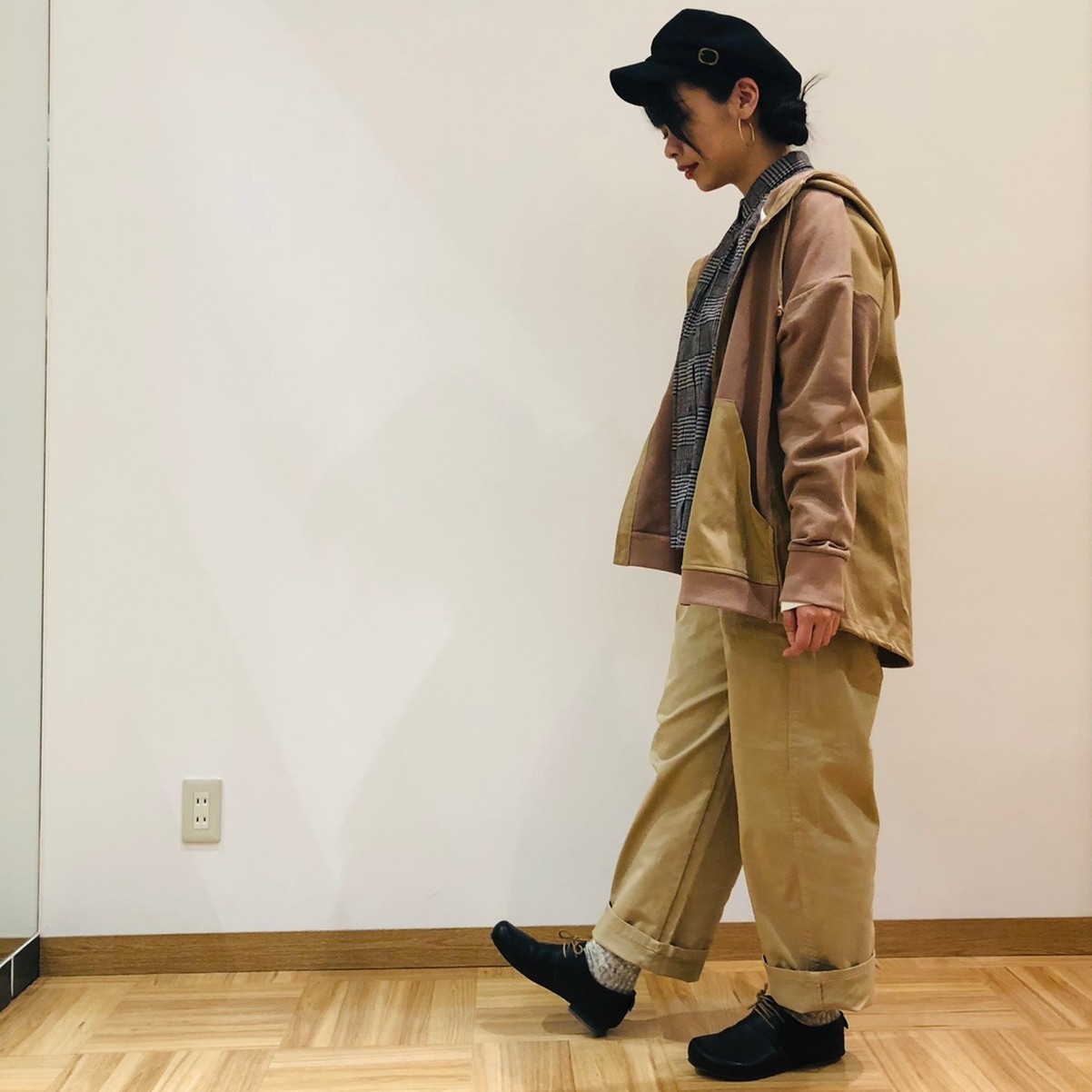 ワイドパンツとパーカーでカジュアルにしつつも、