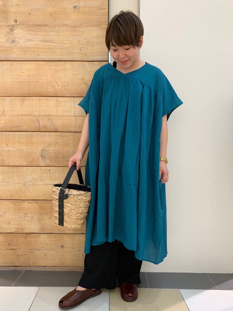 「鮮やかなブルーのワンピース×レギンスで大人綺麗目コーデ。」