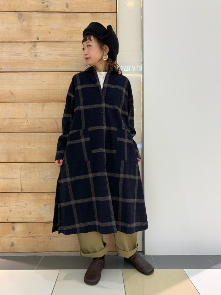 チェック柄のシャギーコート×チェック柄のロングシャツワンピを個性的に合わせてみました。