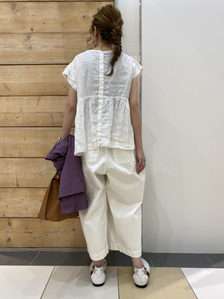 今年トレンドのホワイト上下を軸にワントーンコーデ。そこにアクセントで今年トレンドのパープルをプラスし、清涼感のある上品な印象に。