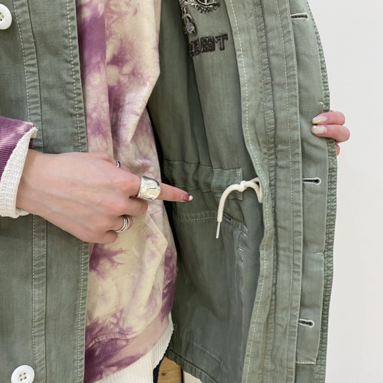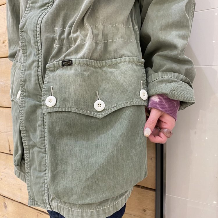 ビンテージ感満載のミリタリージャケットはウエストをブラウジングする事で、女性らしさをプラスしてくれます。