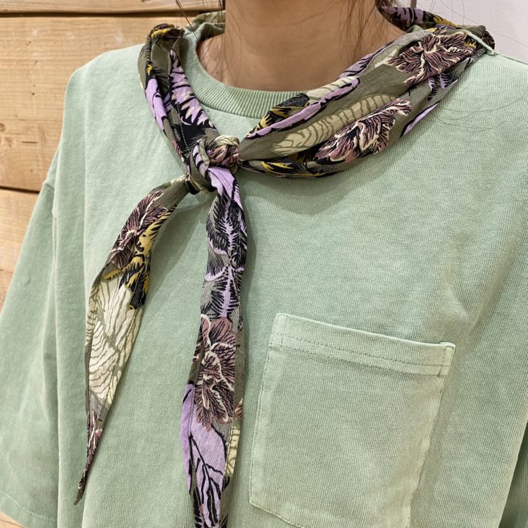 アロハ柄のストールがポイント。ストールがあるだけで一気に華やかさUP!少し派手な柄ですが、シンプルなコーデにポイントで取り入れると引き締まったバランスの良い印象になりますよ★