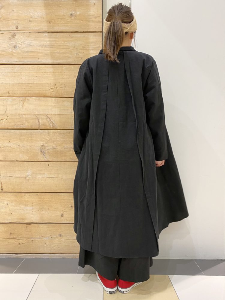 左右アシンメトリーの切り替えになっているこちらのワンピース。今回は羽織にしましたが、一枚で着て頂いても主役になれるワンピースです。