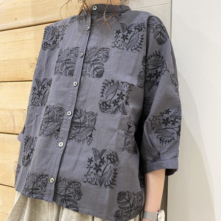 タイル風に配置された刺繍が特徴的なブラウス。