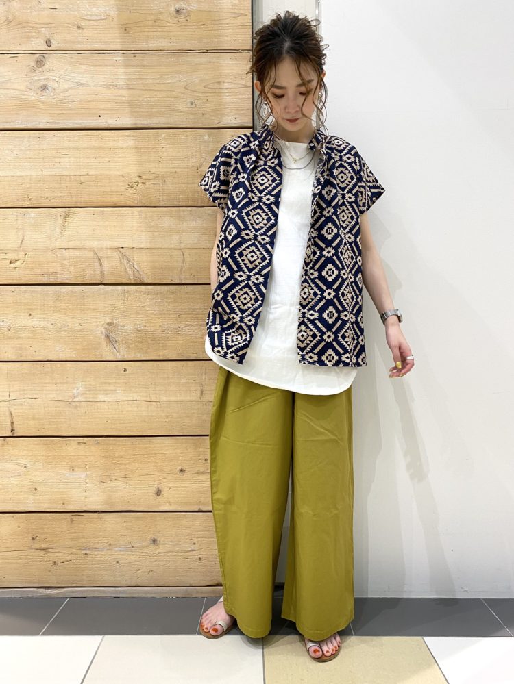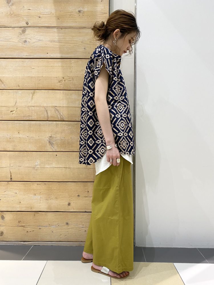 今回はチマヨ柄=ネイティブアメリカンの伝統柄なので、その雰囲気をイメージし、ヘルシーなパキッとしたカラーで合わせてみました◎上下の組み合わせにコントラストを付ける事でメリハリのあるスタイリングに仕上がります♪