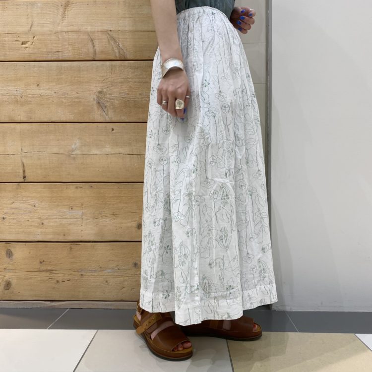綿麻のふんわりとした刺繍スカート。ギャザーがたっぷり入っているので、ラインを拾わず安心です。プラント柄の刺繍がポイントです◎