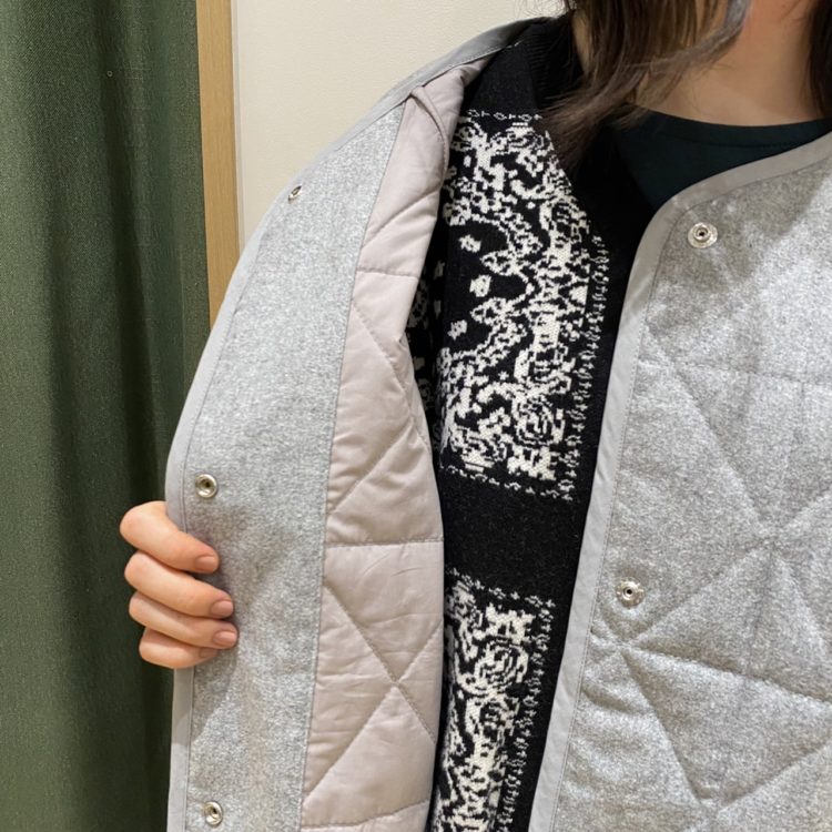 【ウール混フラノ中わたキルティングノーカラーロングコート】