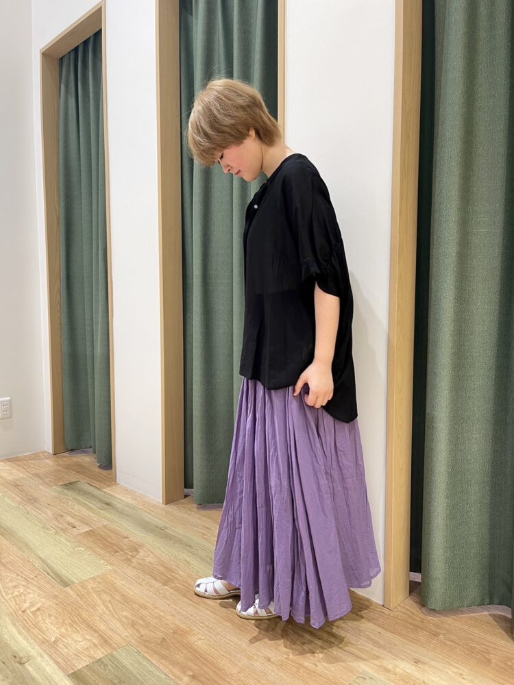 透け感があるシャツとボリュームを抑えたカラースカートを