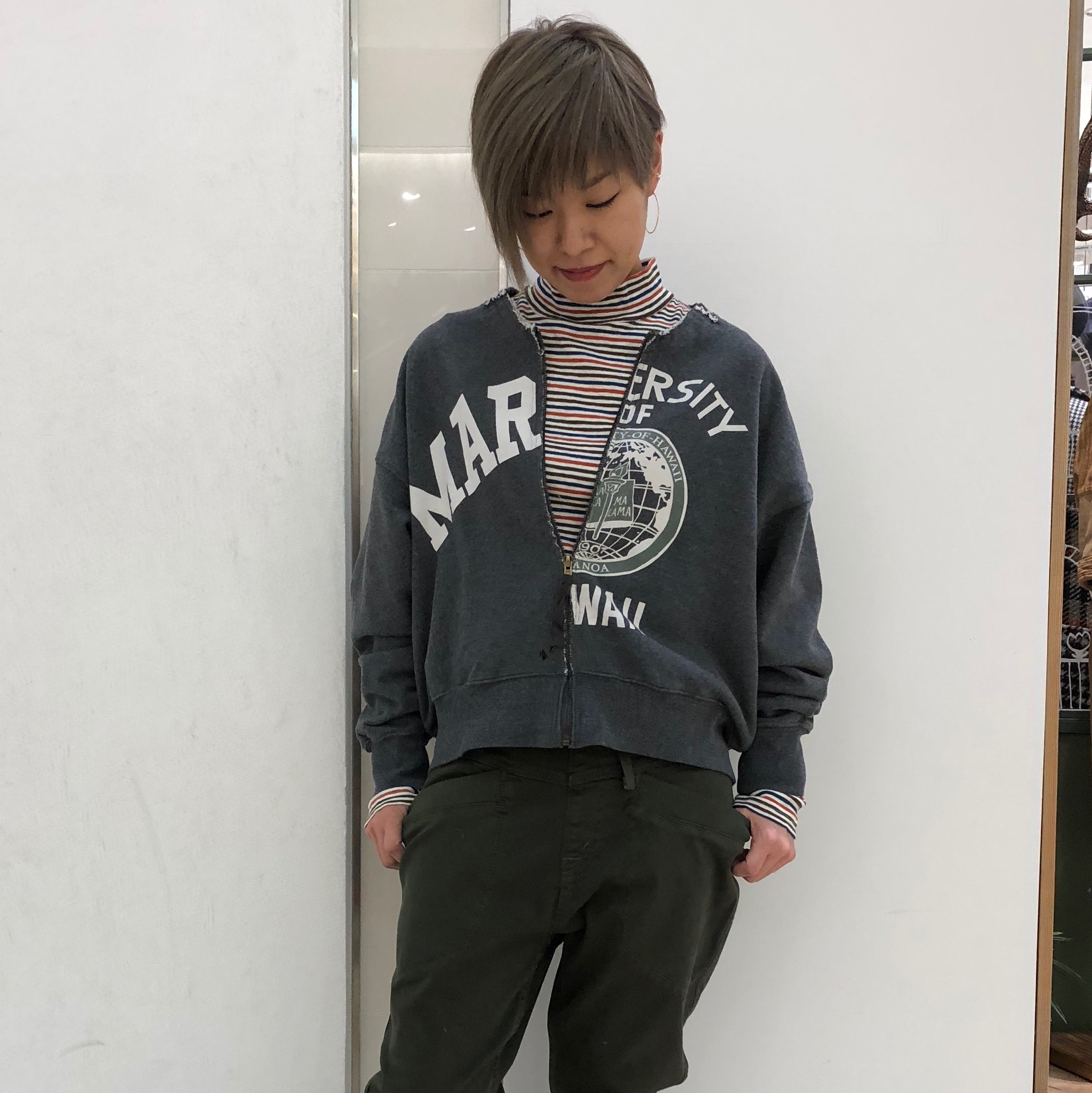 トレーナーは着丈短めで
