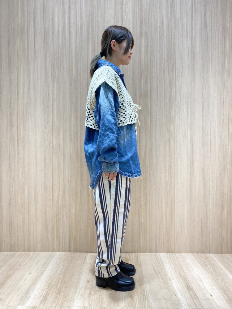 デニムシャツのヴィンテージ感をパンツで軽やかに、かぎ針のベストで甘さを足して今風のスタイルに仕上げました。