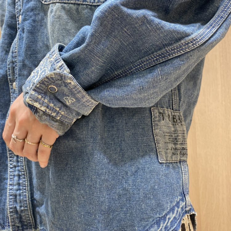 ヴィンテージ感あふれるデニムシャツはウエスタンタイプ。ヨークの部分が色濃く残るリメイクに。