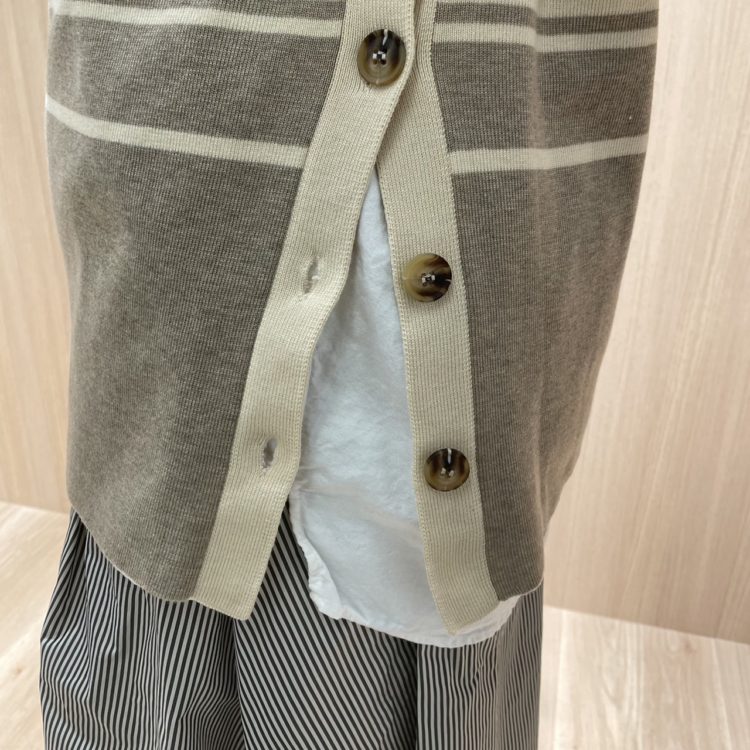 サイドがボタン止めとボーダーが特徴的なニットベスト。