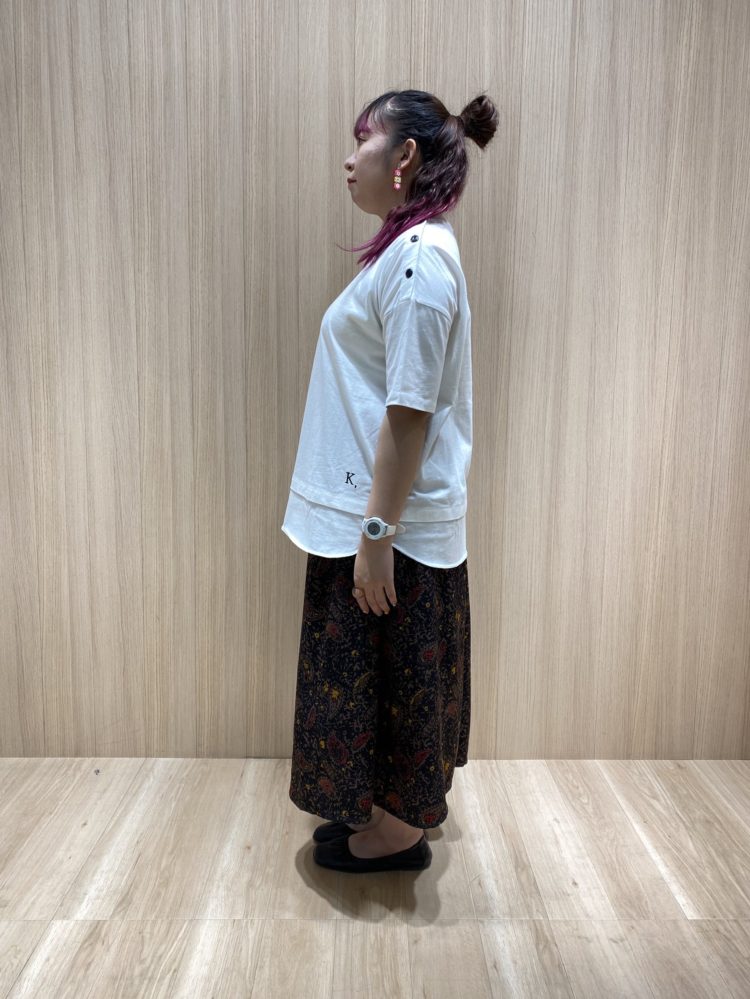 シンプルにエスニックスカートが主役のコーデ。肩にアクセントが付いているのでシンプルながらもこなれ感アップです↑