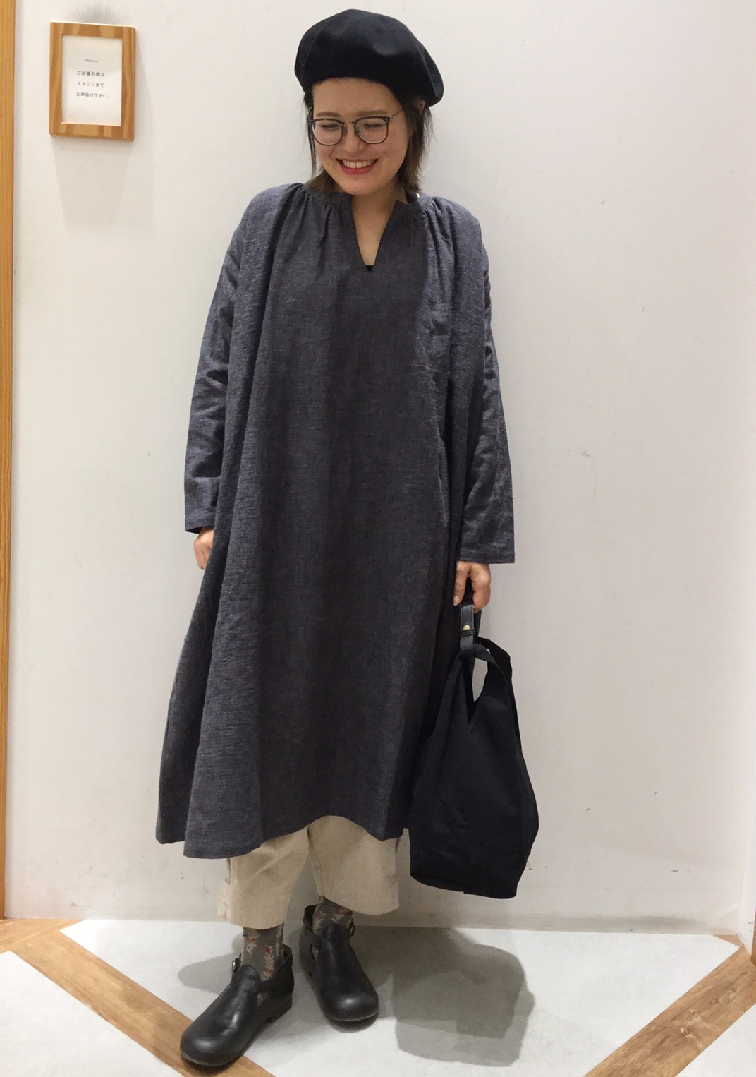 【綿麻Wガーゼキーネックギャザーワンピース】