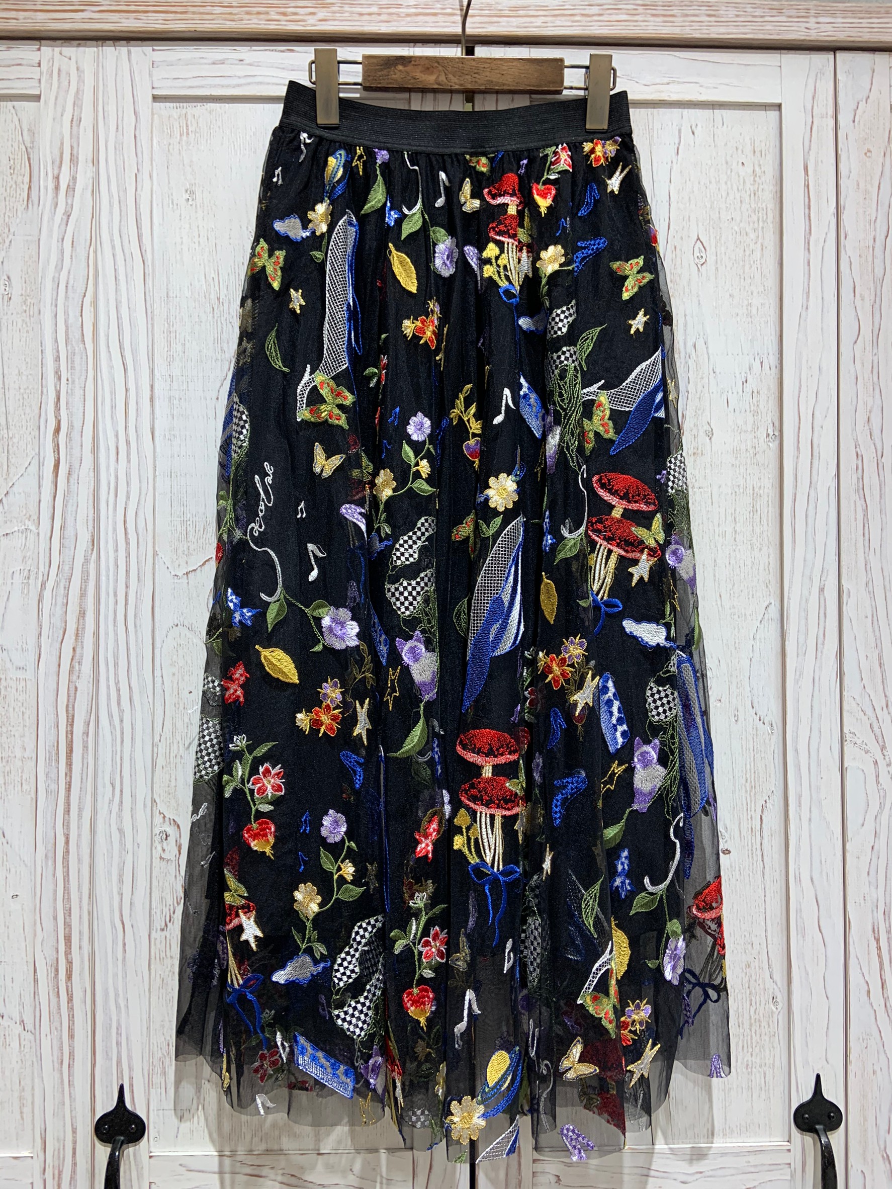 ▽キノコ蝶くじら柄チュール刺繍スカート