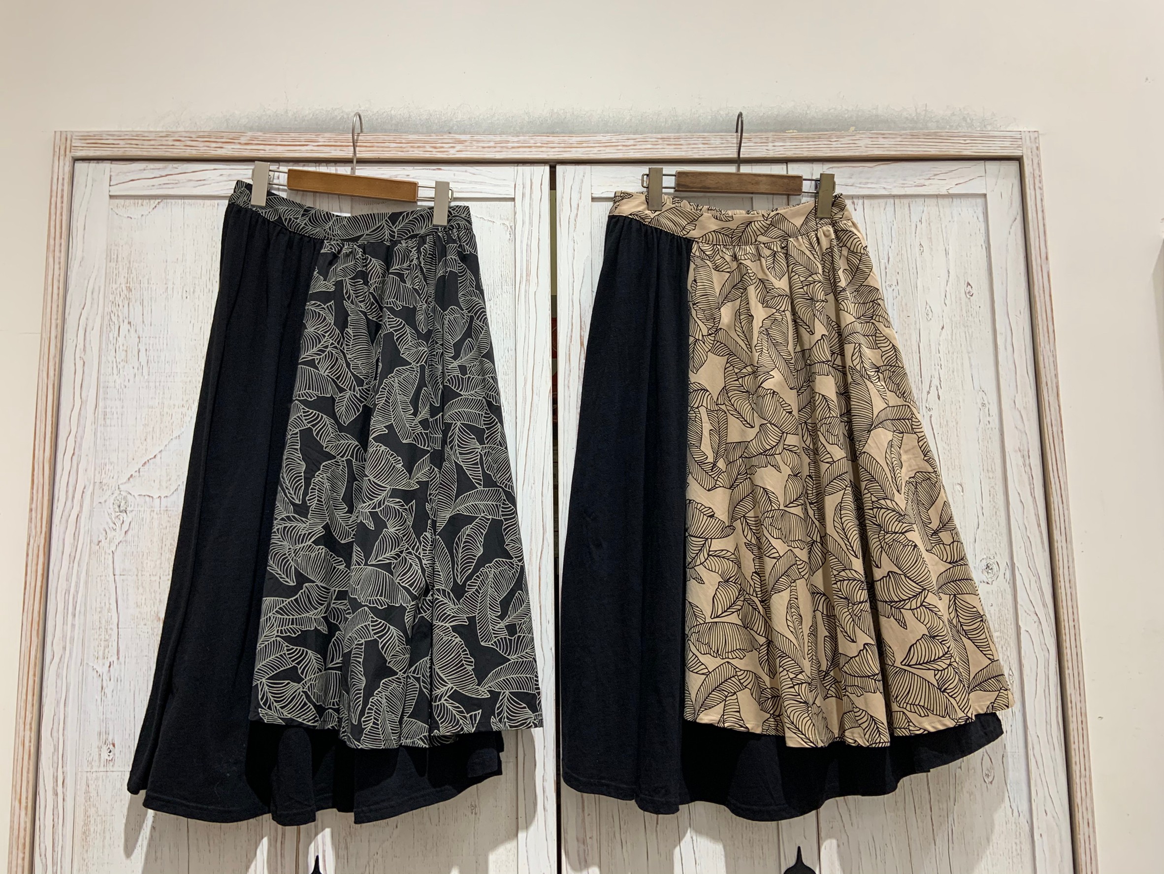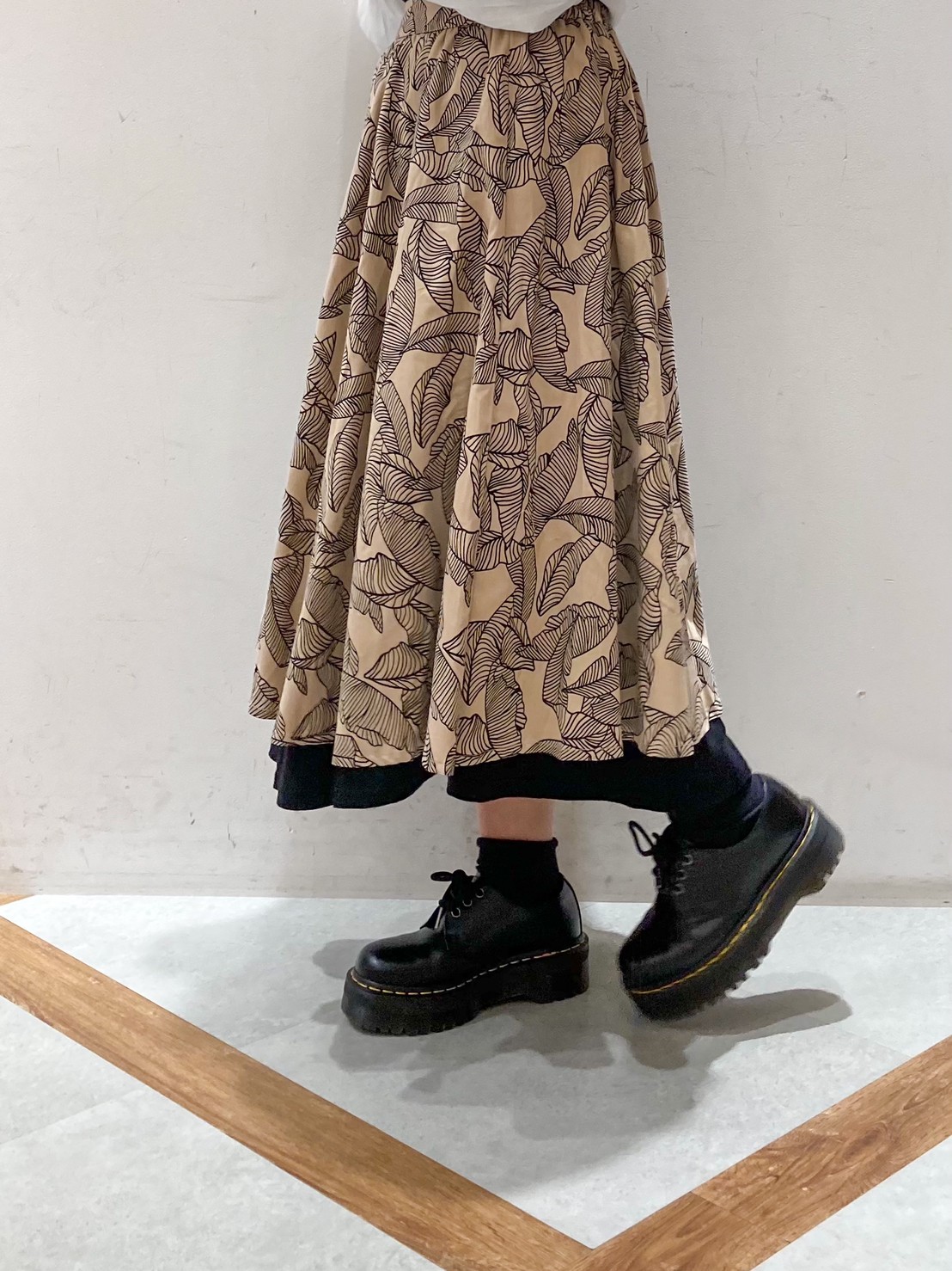 シックな色合いでブランドオリジナルのワントーンで描いたリーフプリントがあしらわれた、女性らしいデザインのスカート!