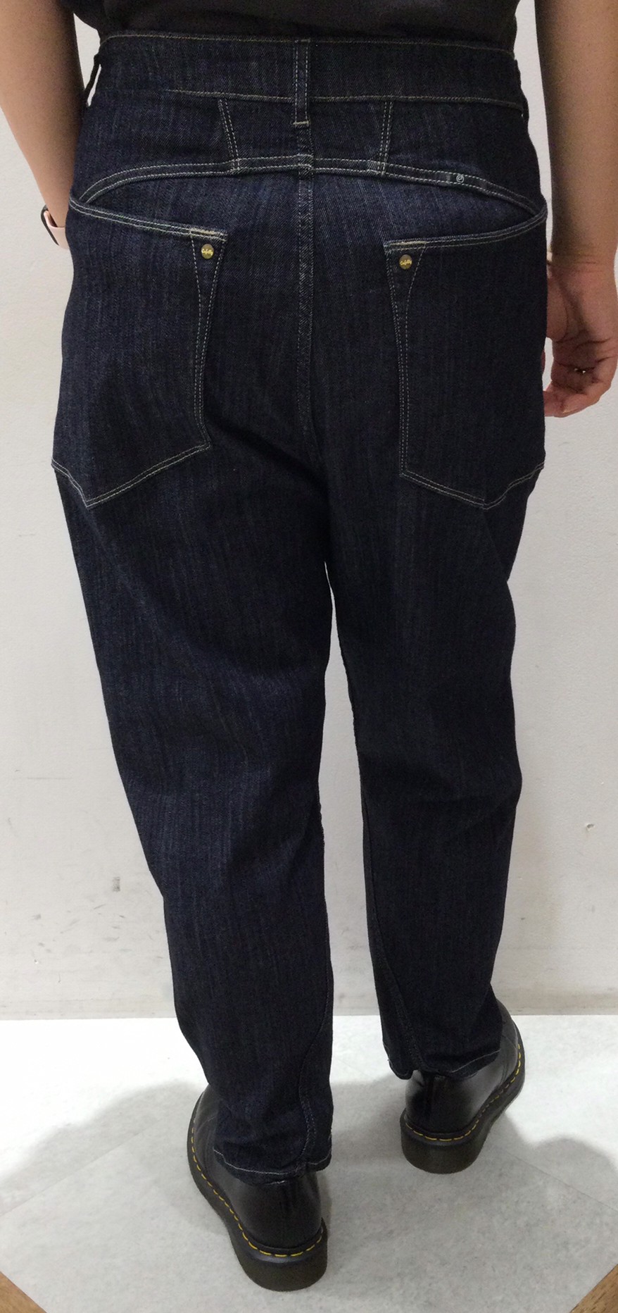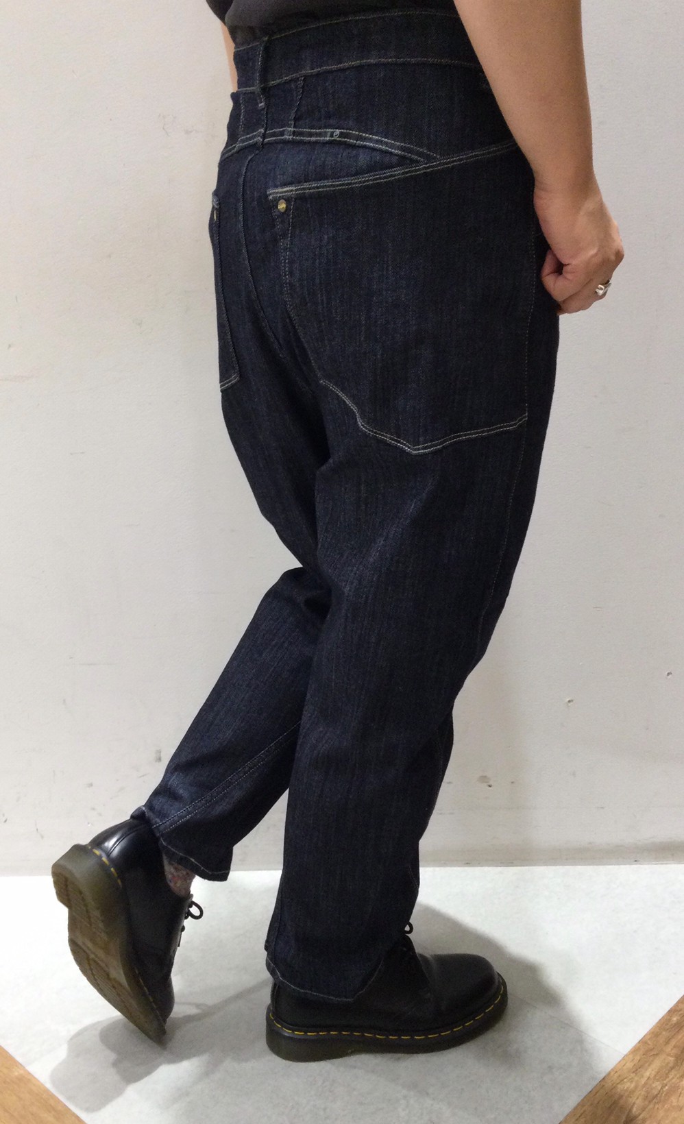 サルエルとペグトップを足したような、ボリュームのあるストレッチデニム。
