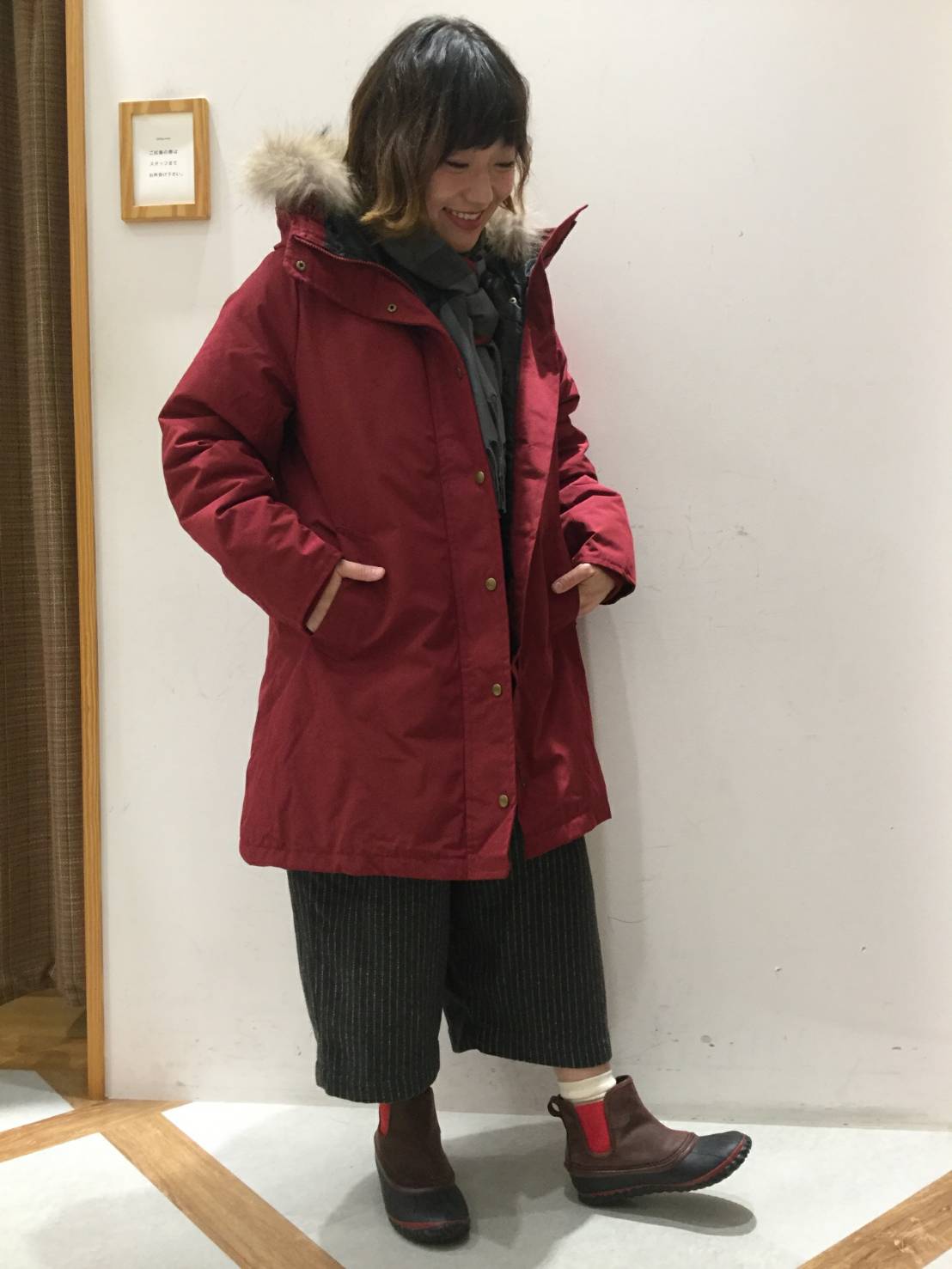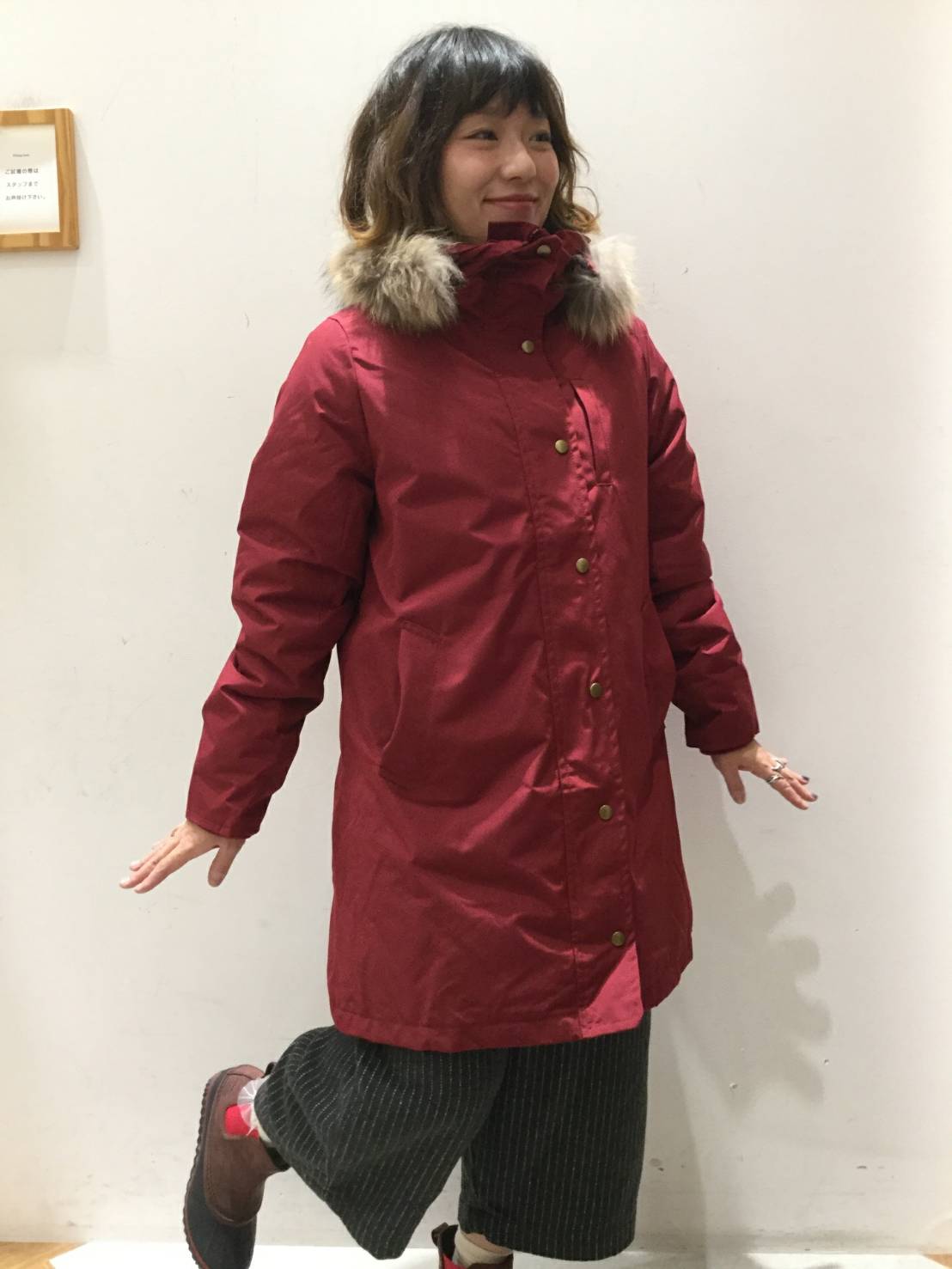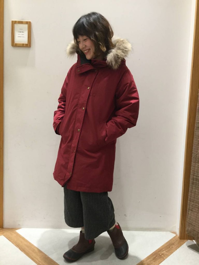 ワインレッドのアウターでコーディネートしました