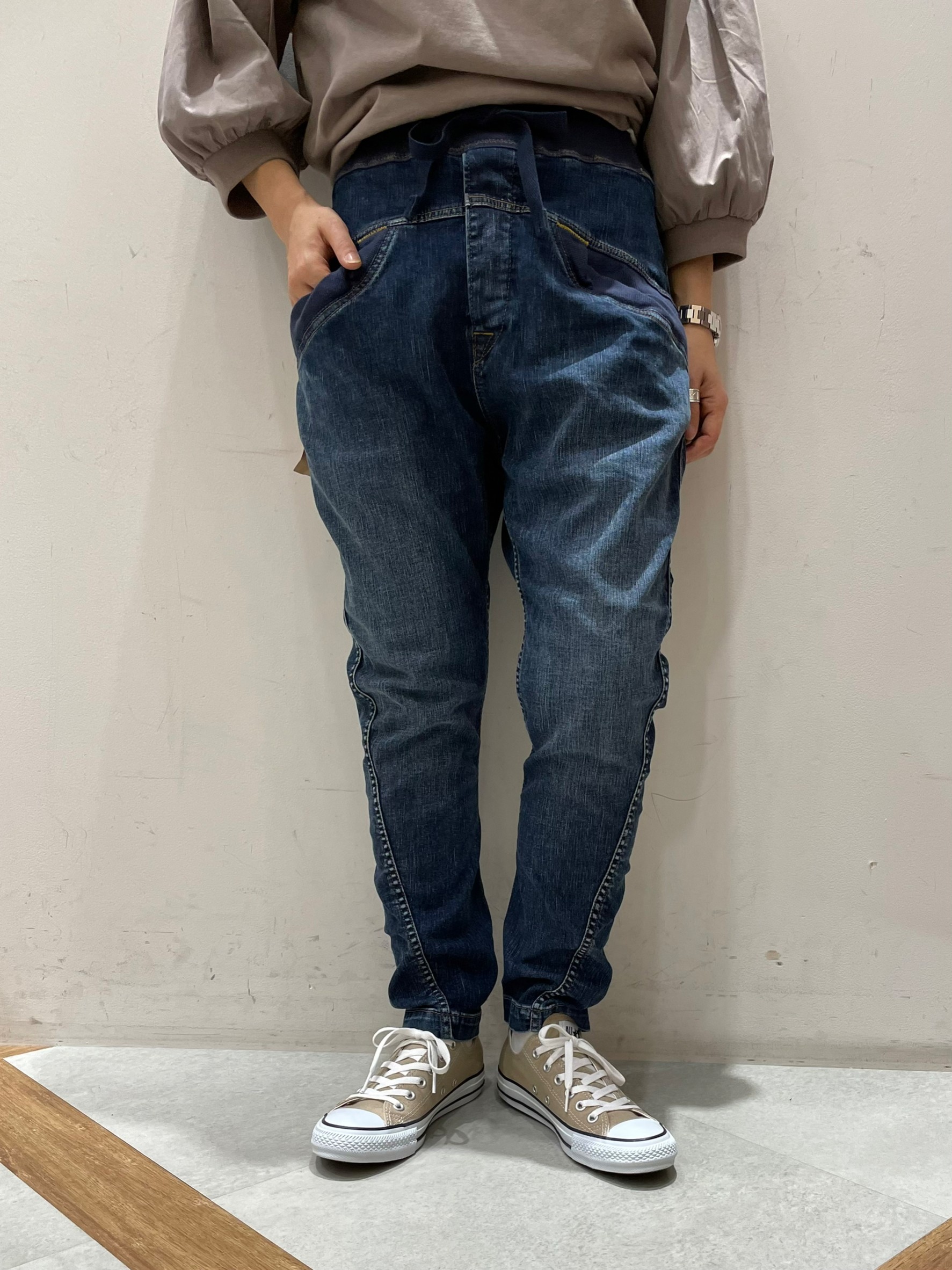 ヒップから膝上にかけてはゆとりがあって、膝から裾にかけて細くなるサルエルスキニーのようなテーパードシルエット。