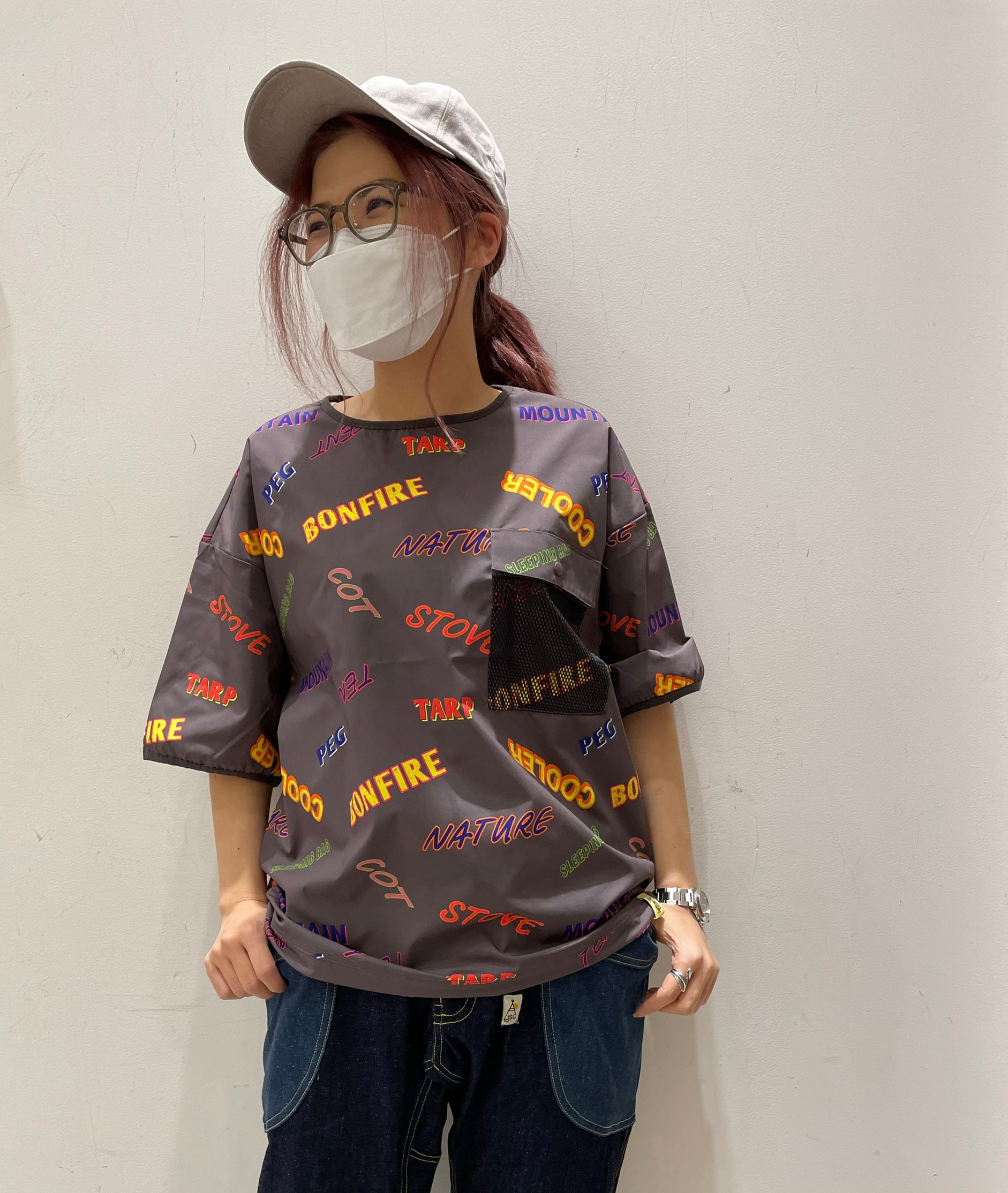 遊び心のあるプリントトップスに配色パンツを合わせた、梅雨前の外遊びスタイル!