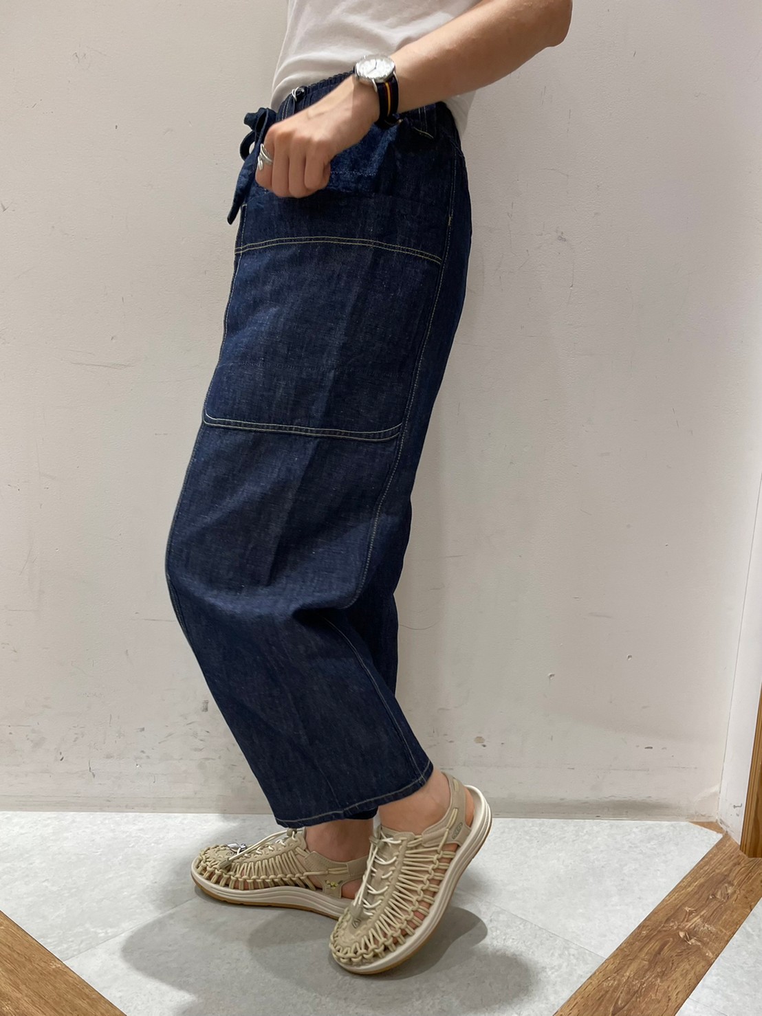 ドライタッチな風合いが特徴の綿麻生地を使用したデニム。程よくハリ感とシャリ感があり身体のラインを拾いません。