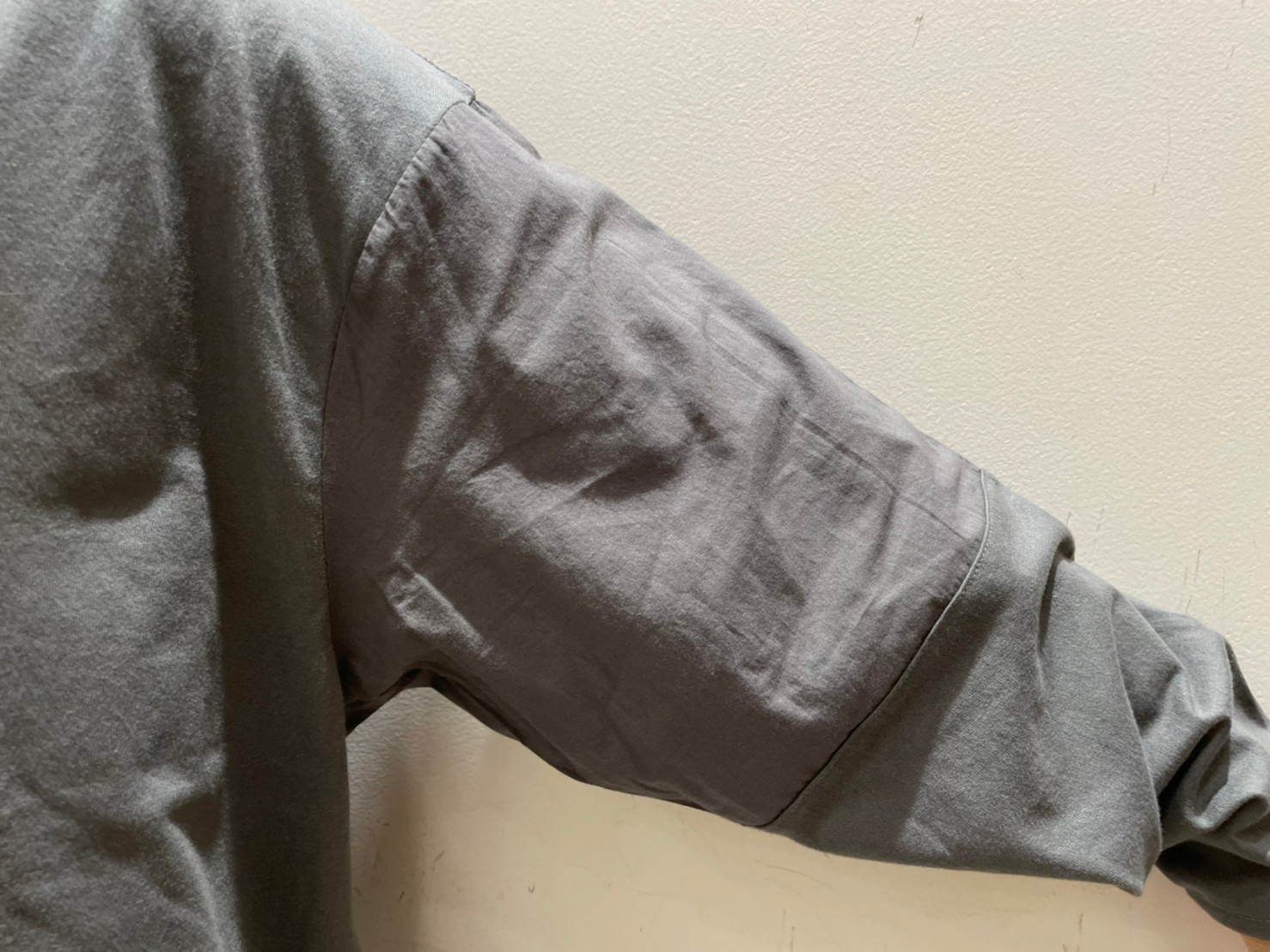 袖の一部分を布帛で切り替えたのがデザインのポイント。