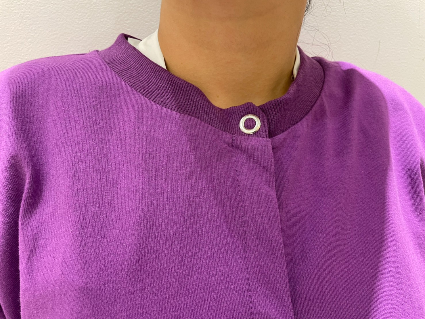 綿100%生地を使用していて、Tシャツのような薄手の生地のクルーネックカーディガン。