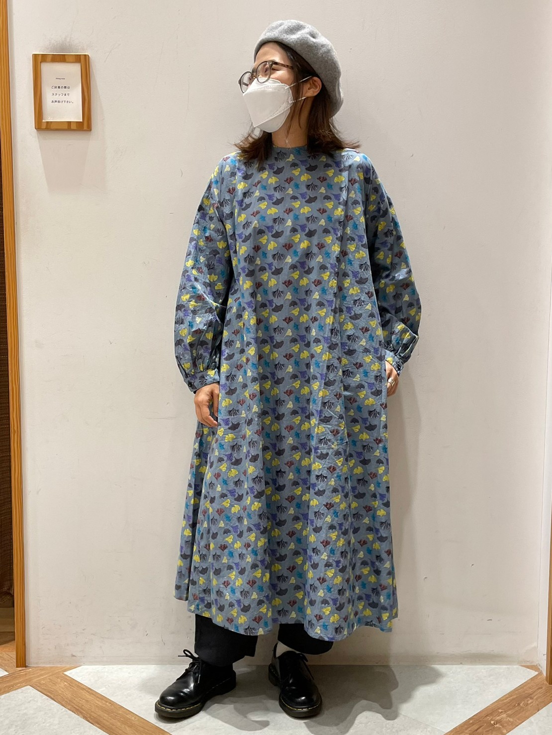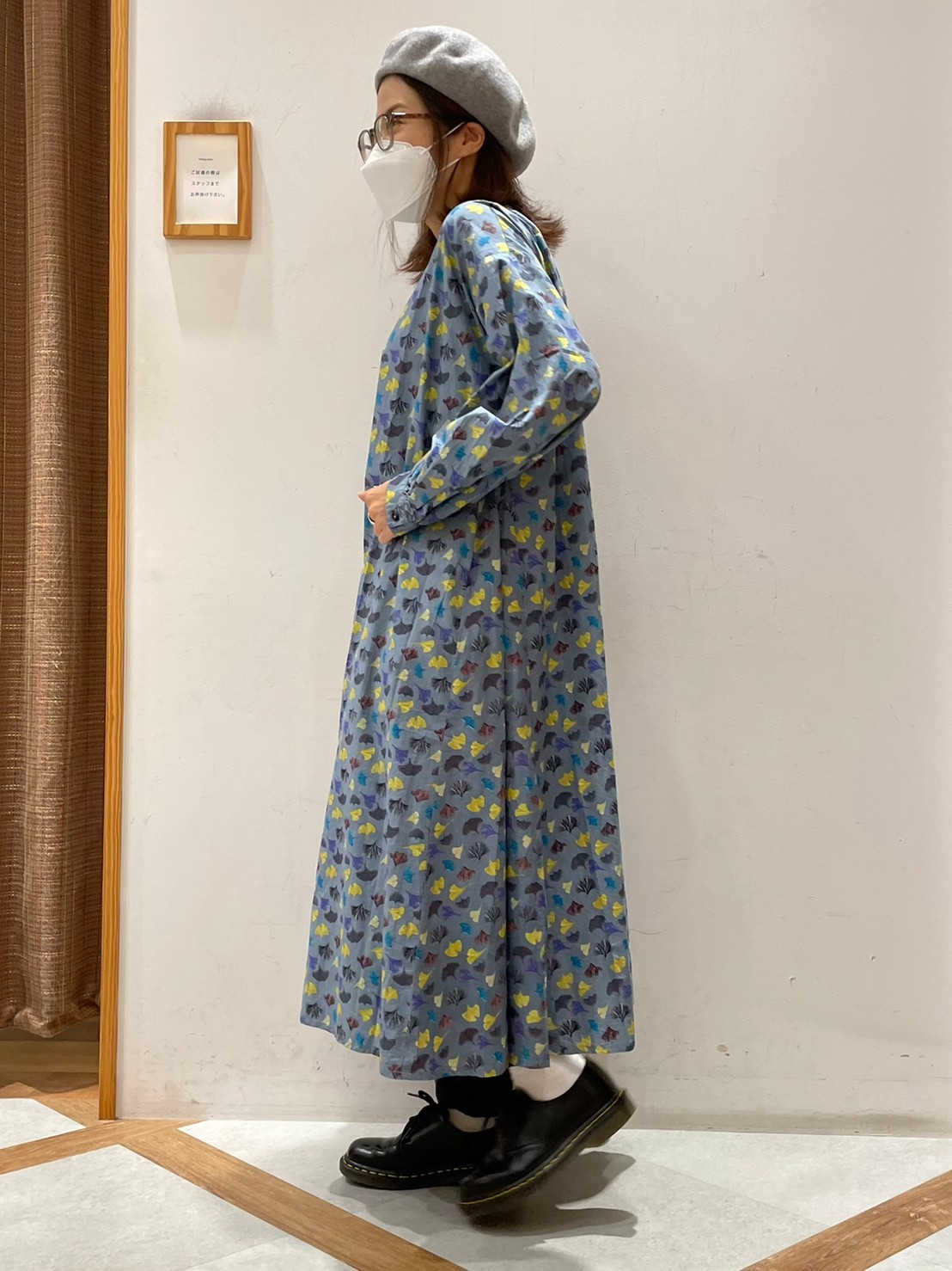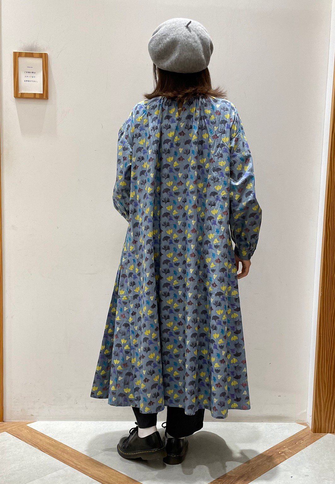 シンプルコーデにも映える、季節感あふれるいちょうのぱっぱプリントは、インドの手仕事・手捺染プリントによるもの。 手仕事ならではの素朴さで、あたたかみのある雰囲気に仕上がっています。