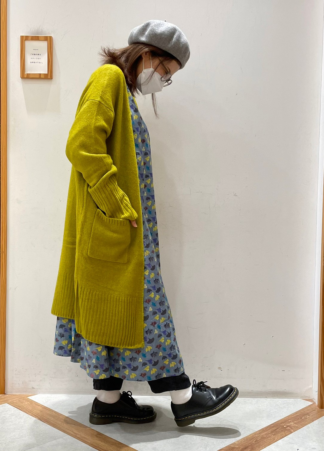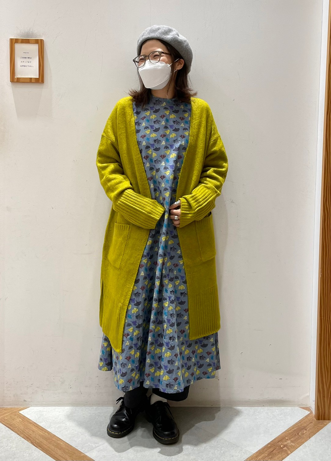次は私が柄ワンピースにライムカラーのカーディガンを合わせたコーディネート!