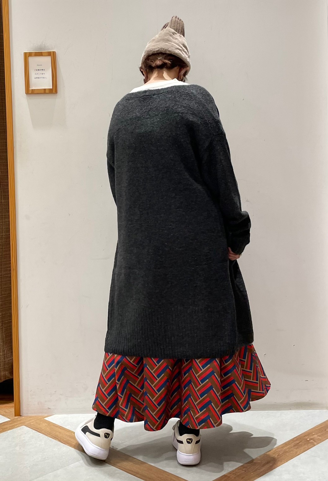 鮮やかな柄スカートにシックな色合いのチャコールカラーのカーディガンを合わせた、どなたにでも取り入れやすい大人カジュアルコーデ!