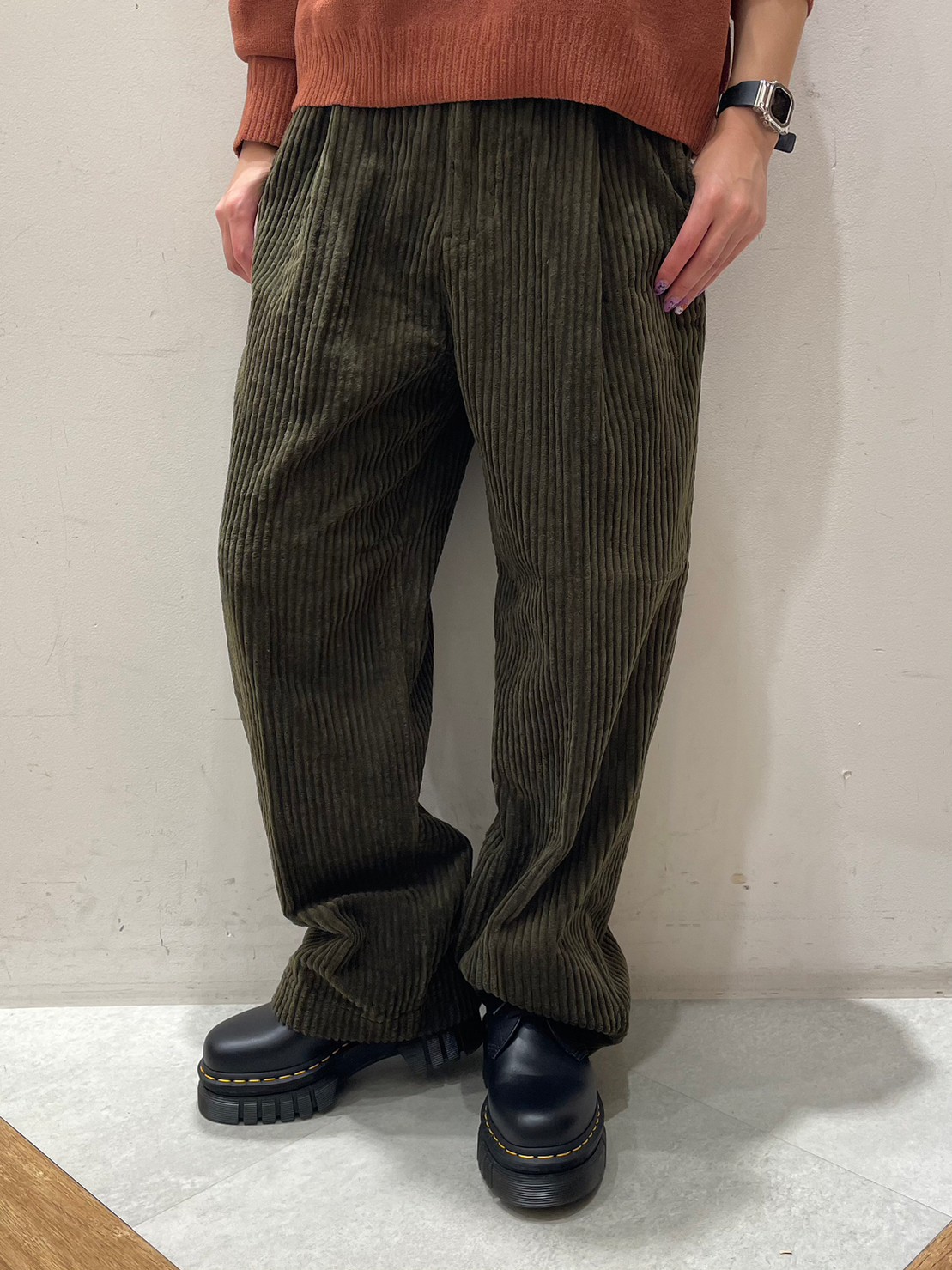 極太のコーデュロイ生地を使った、ワイドストレートのタックパンツ。