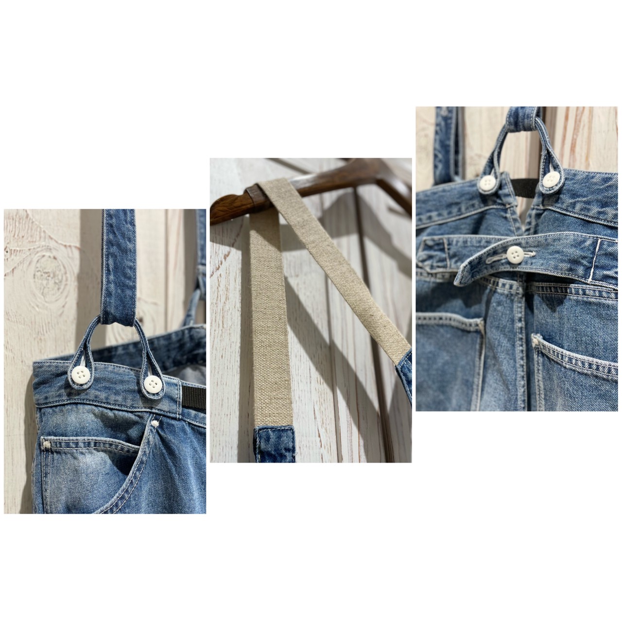 ほどよいルーズ感とデニムの加工感がポイントのサスペンダーワークパンツ。