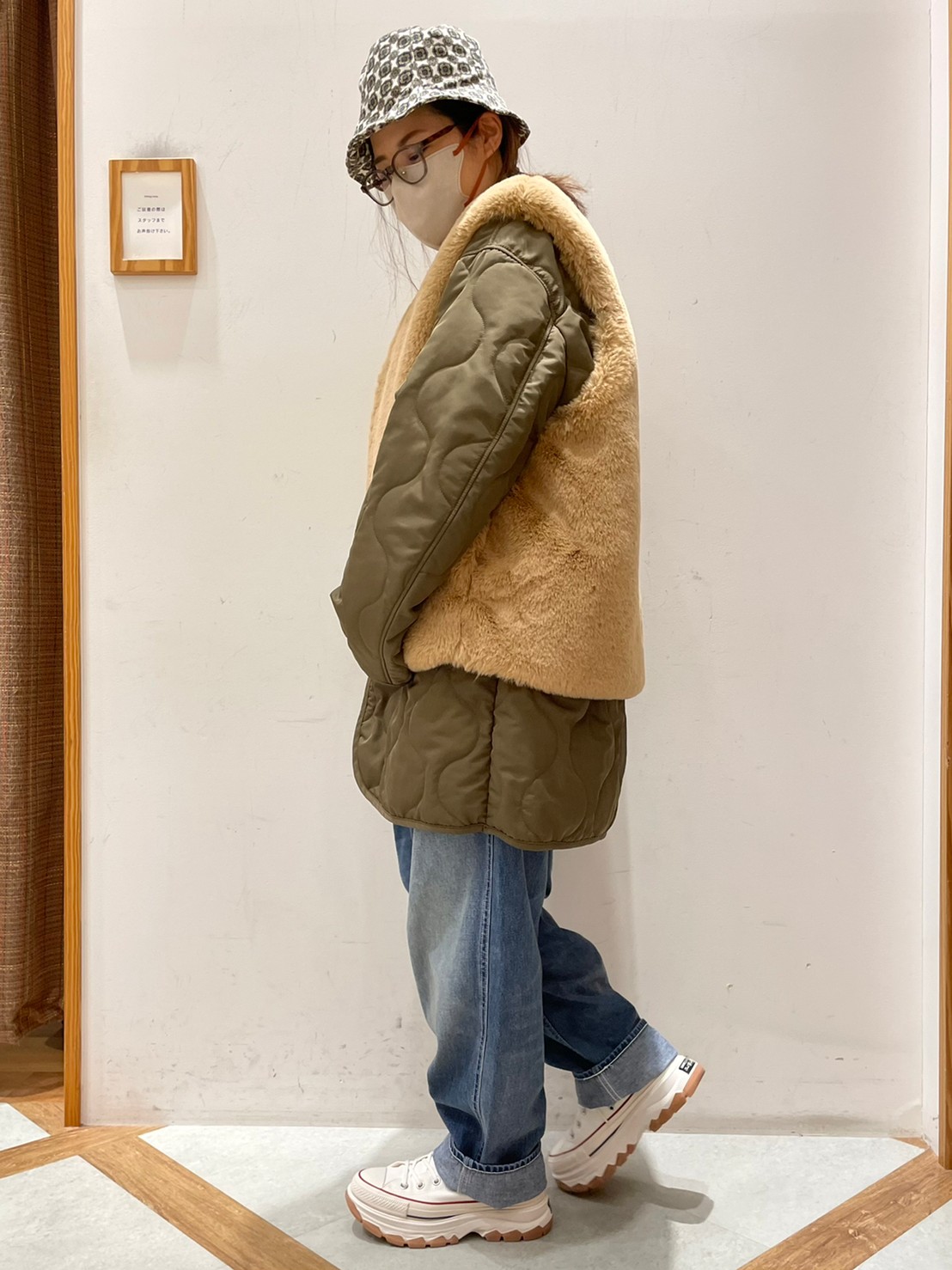 そこに今年トレンドでもあるファーのベストをレイヤードするようにドッキングさせ、