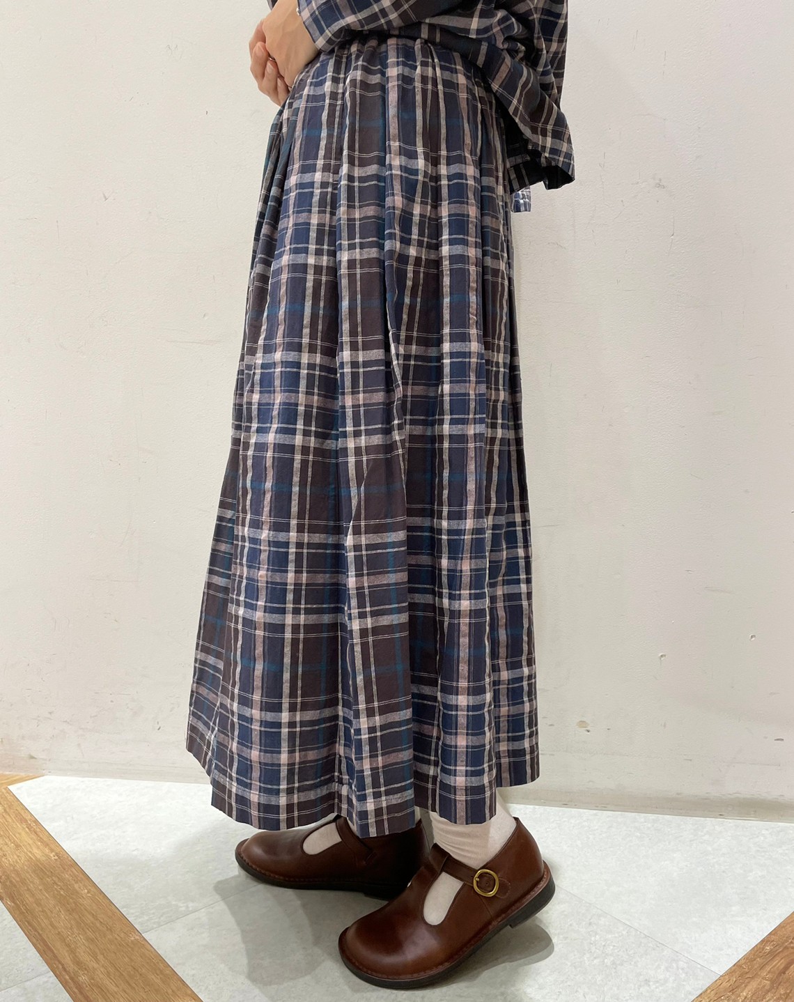 ▽綿麻ポリエステル平織チェック柄タックスカート