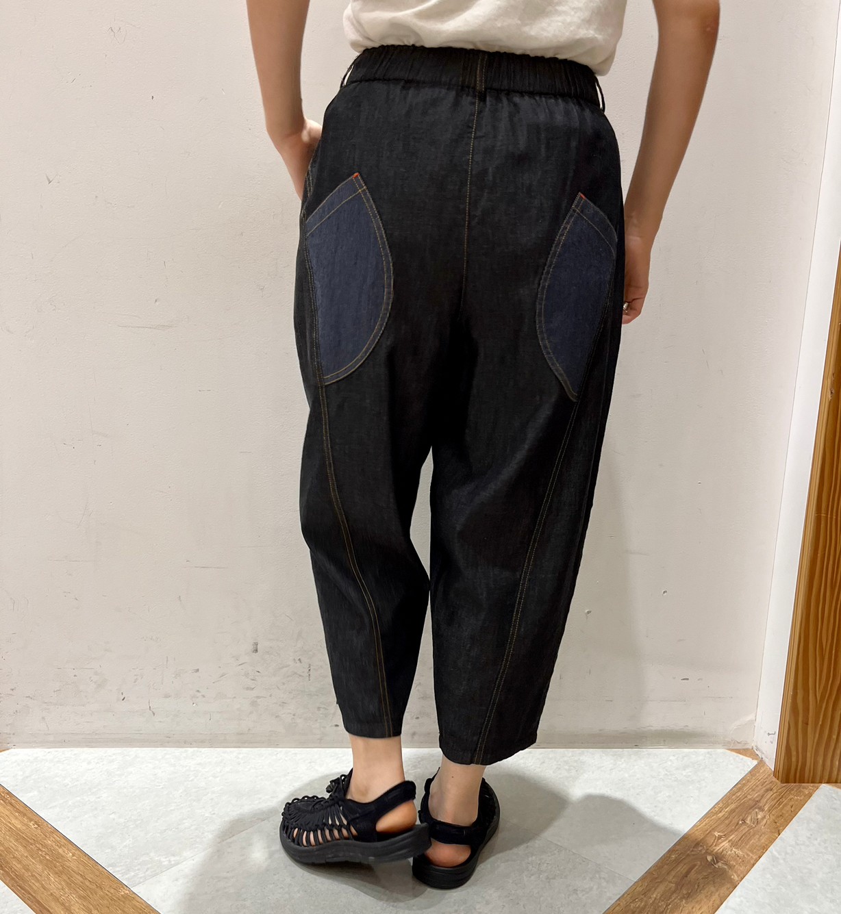 akane定番のゆったりシルエットのパンツはタテに大胆な切り替えと異素材のストライプの組み合わせが新鮮!!