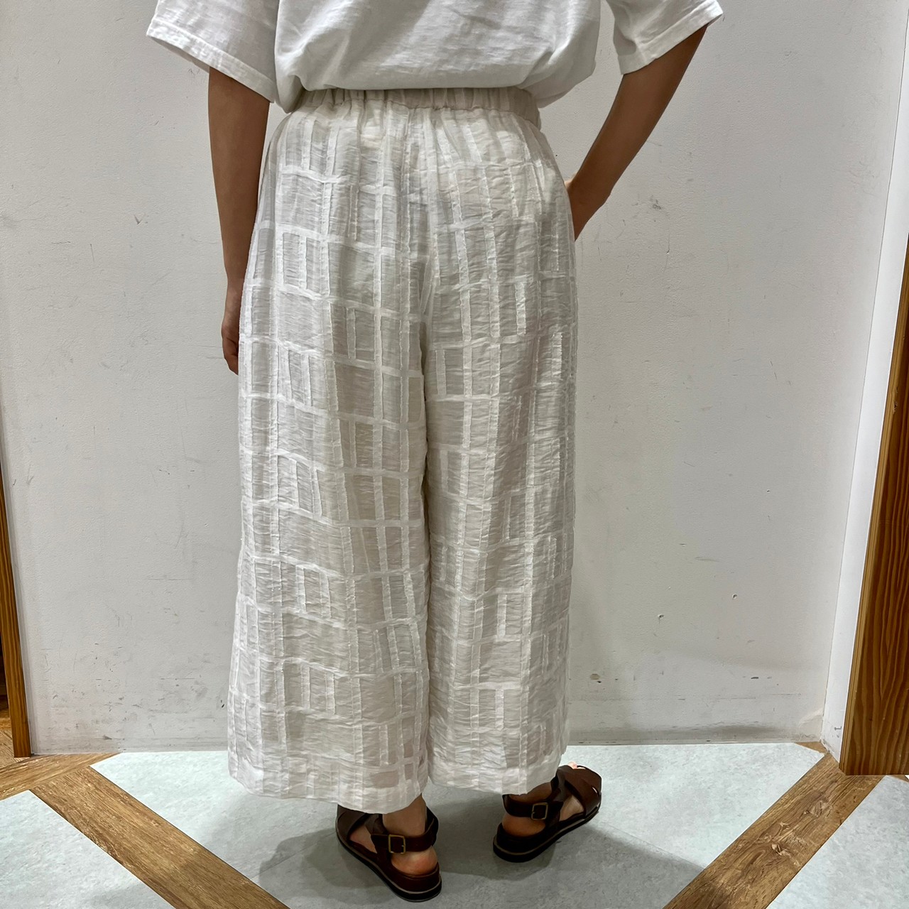 幾何柄の透ける部分と透けない部分がある、特殊なジャガード素材のパンツ。