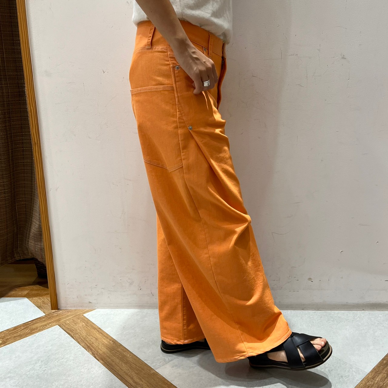 夏らしいオレンジカラーのボトムスを差し色に使った、遊び心あるカジュアルな着こなし!