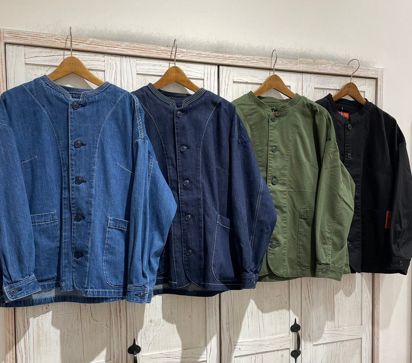 ヴィンテージワークテイストの小さな立ち衿がポイント。