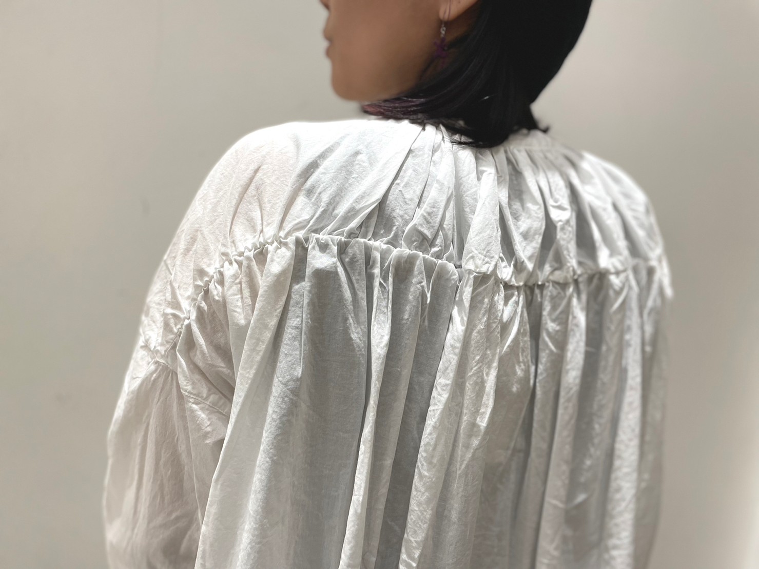 ▽コットンローン製品染めバッグギャザーワイドシャツ