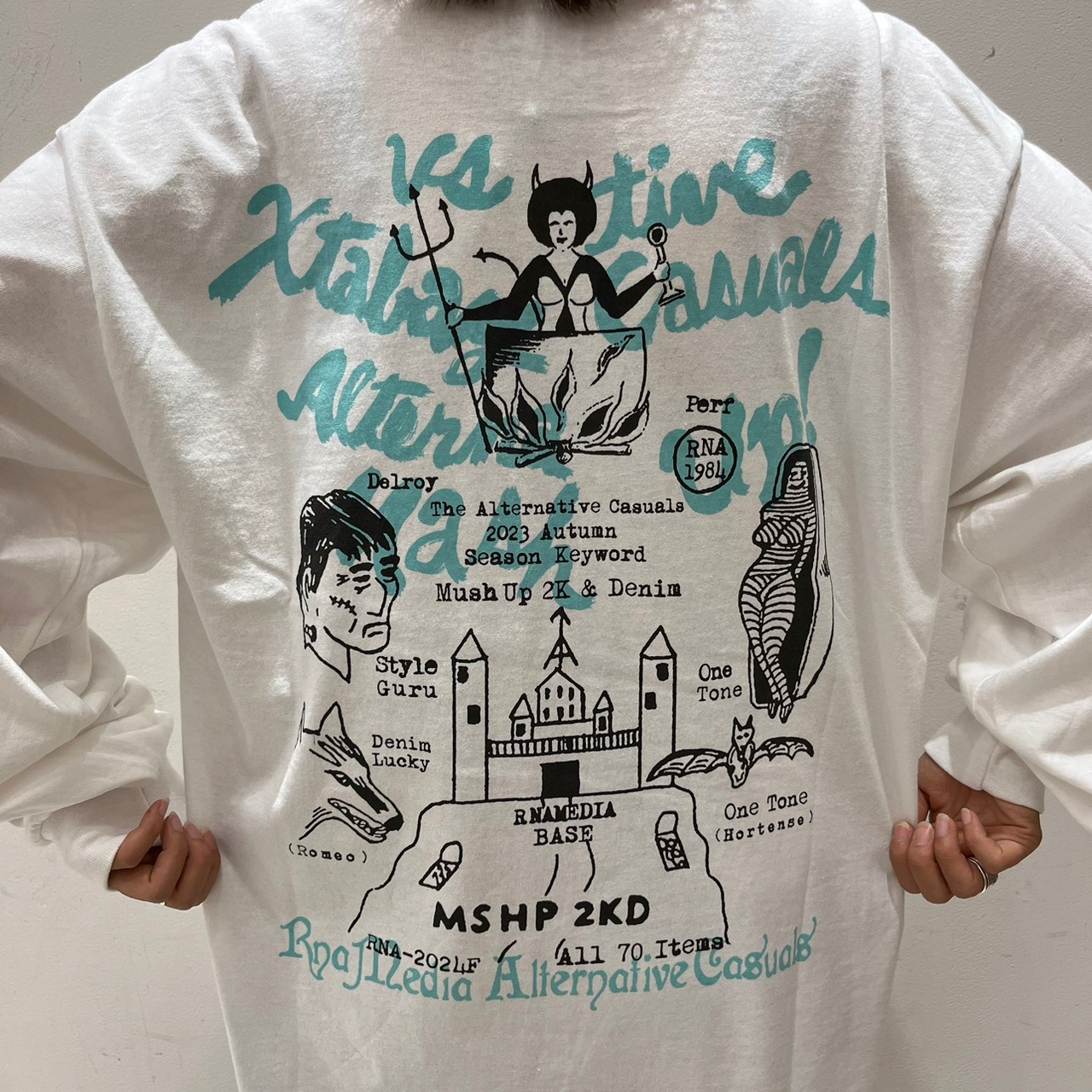 遊び心のあるアートワークがハンドスクリーンでプリントされた長袖Tシャツ。