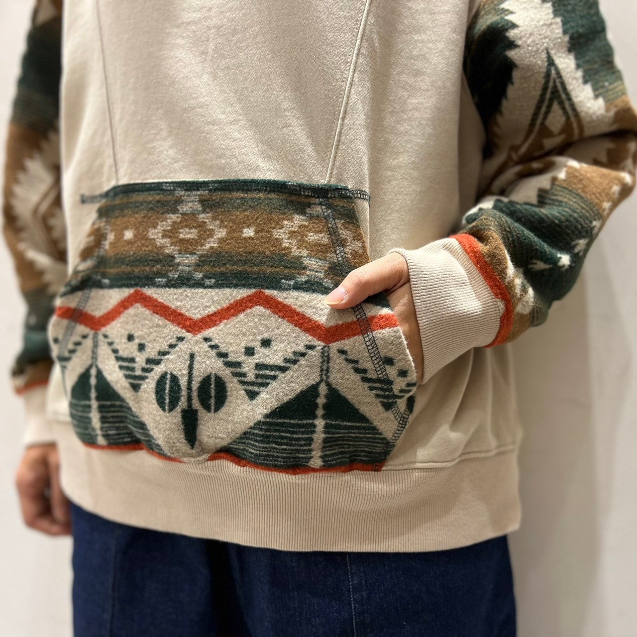 エスニックなオルテガ柄の異素材パーカー。