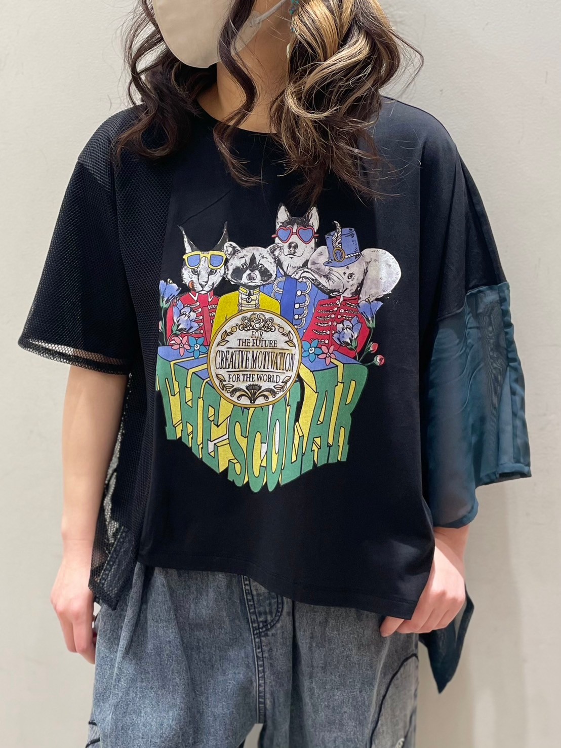 ▽メッシュ×シフォン異素材切替 アニマルプリントプルオーバー