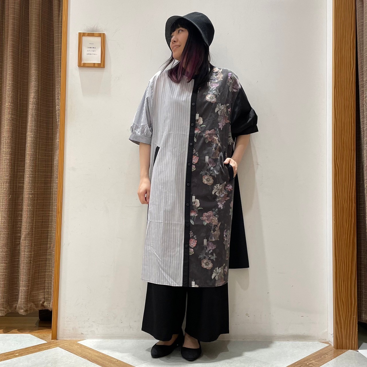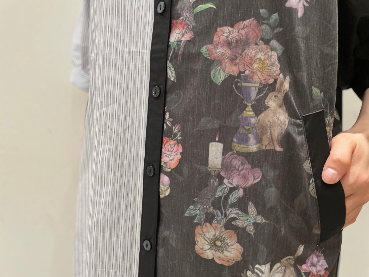爽やかなストライプ生地と、お花やアンティークモチーフを散りばめたアート柄を切り替えた遊びゴコロたっぷりなシャツワンピースの登場♪