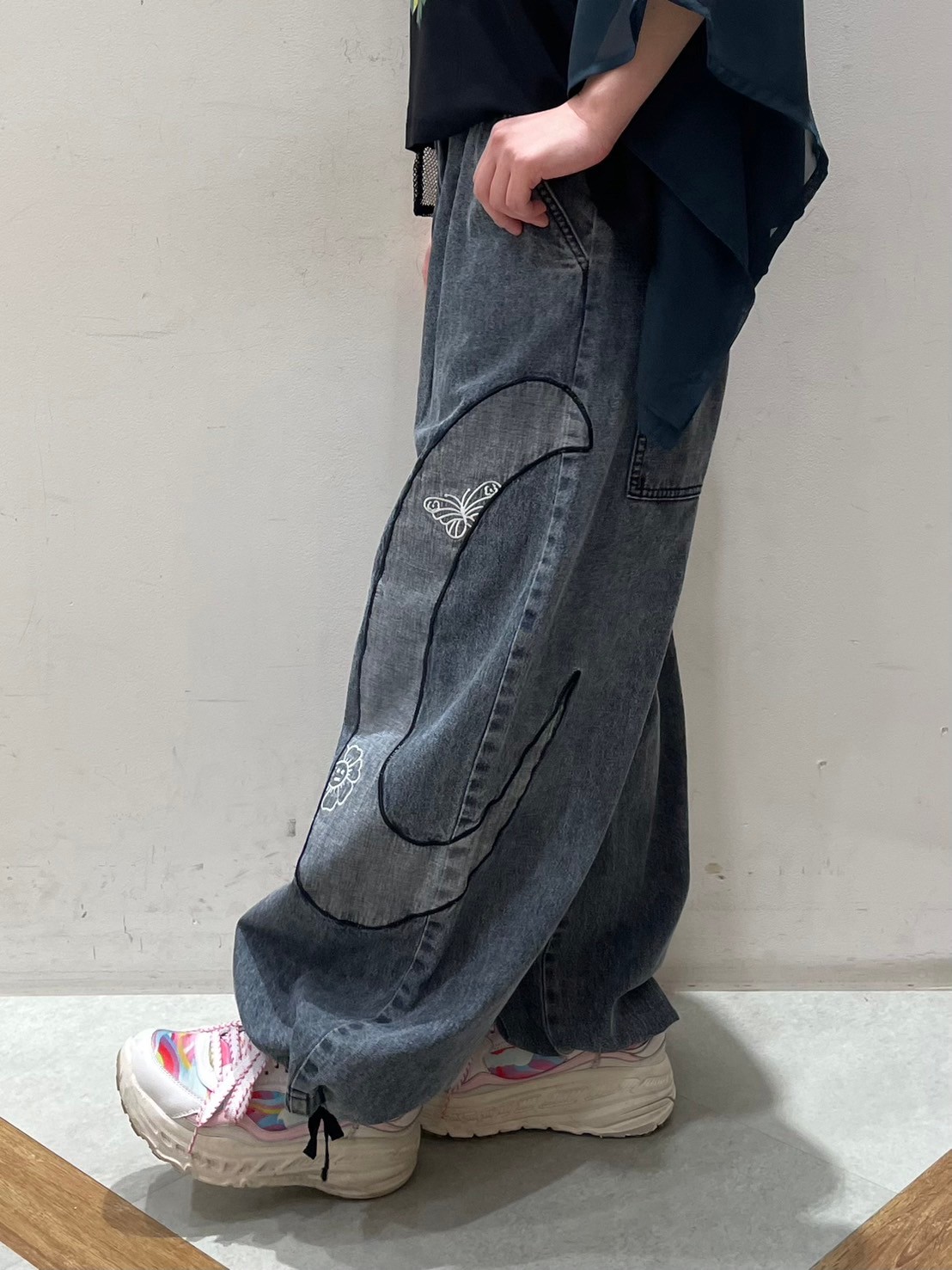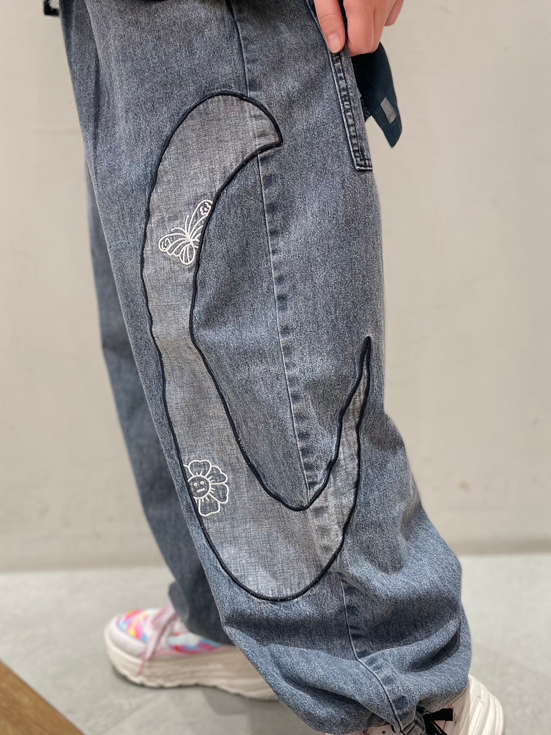 両サイドに施したBIGなアップリケ刺繍をアクセントに効かせた、抜け感漂うデニムパンツ。