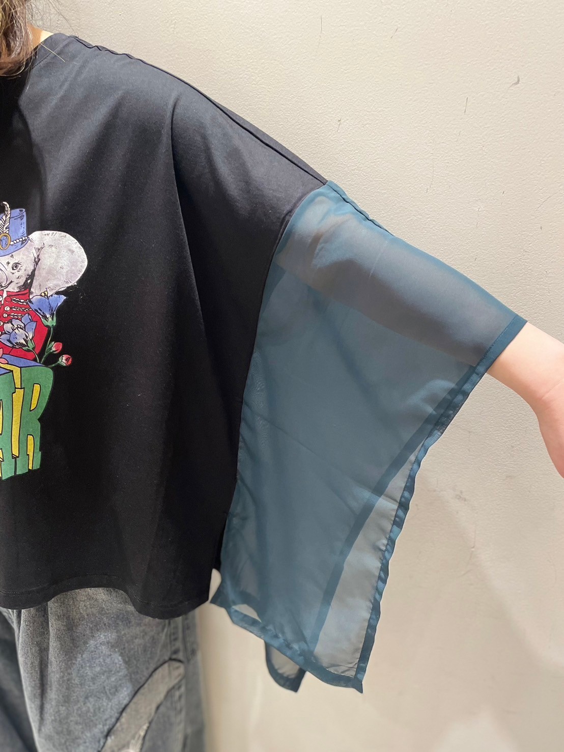左腕にはほんのりシアー感のあるふんわりシフォン生地を切り替え、ゆるやかな生地の落ち感が他にはないおしゃれさを演出。