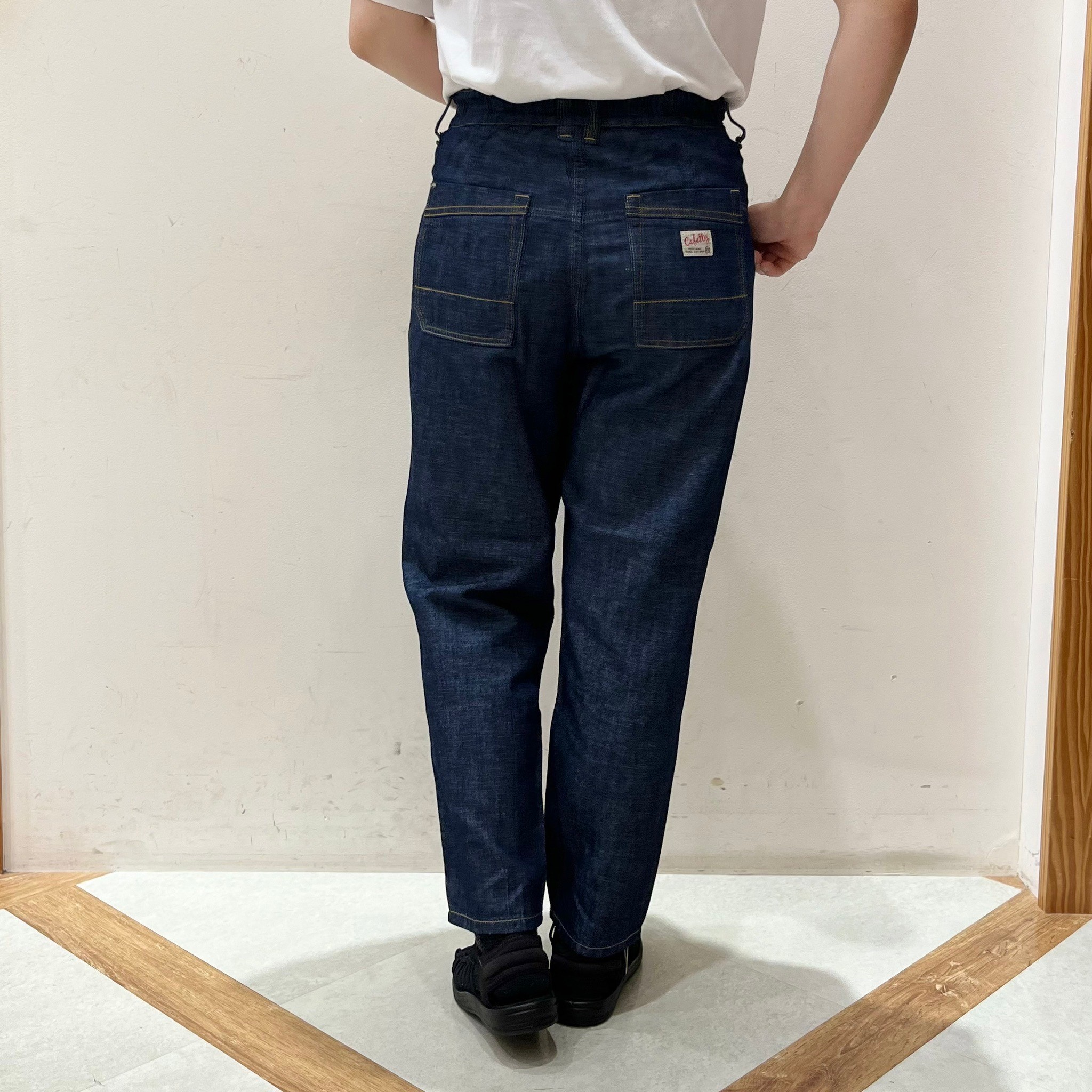 ポケットラインをなぞったコバステッチと内側のステッチに違いをつけてCafettyらしい遊び心のあるステッチワークに仕上げてあります。