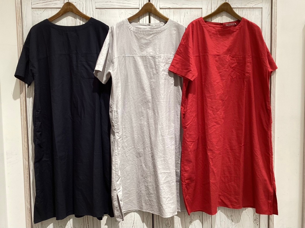 毎シーズン定番でご用意しているワンピースの夏バージョンに夏らしい加工強めの薄いカラーのデニムを合わせた涼しくて楽チンなナチュラルStyle!!
